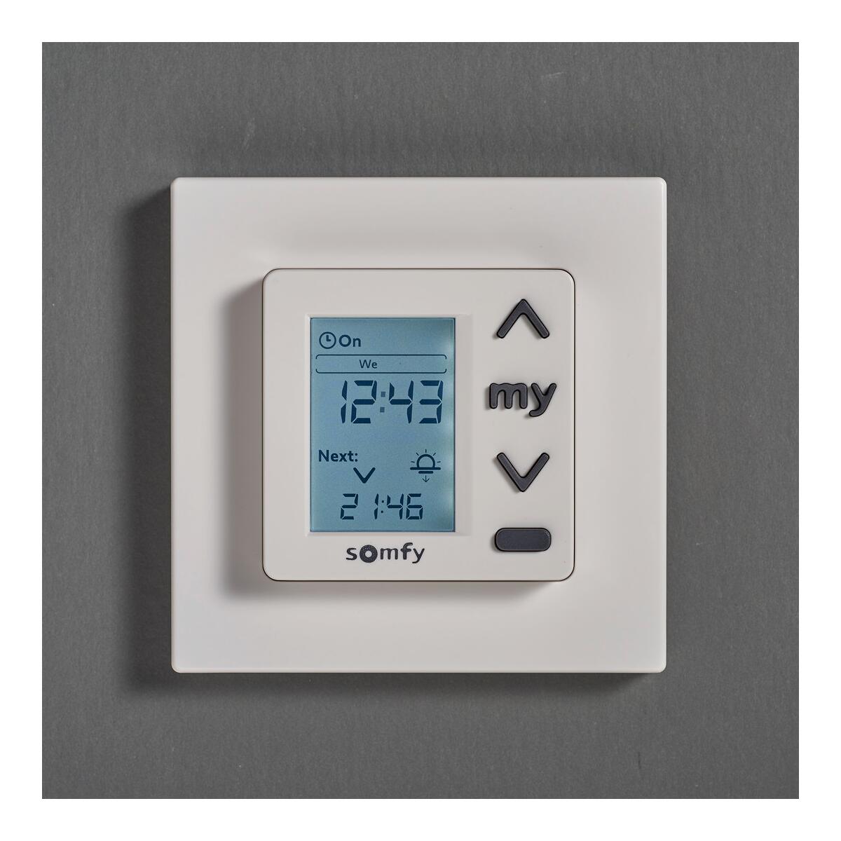 Der neue Chronis Uno ist in erster Linie eine auf Benutzerfreundlichkeit optimierte Zeitschaltzeituhr für Rollladen, Screens oder Raffstores, mit einer Reihe von nützlichen Funktionen im Hintergrund, bei denen man nicht in verschiedene Menüs eintauchen muss, um die Kontrolle zu behalten. Mit den Maßen 50x50 ist er mit handelsüblichen Rahmen führender Schalterhersteller kompatibel, falls der mitgelieferte Rahmen nicht gewünscht ist. Zusätzlich zu den Öffnungs- und Schließzeiten kann eine Zwischenposition manuell mit der my-Taste und automatisch mit der Zuordnung zu einer Uhrzeit erreicht werden.