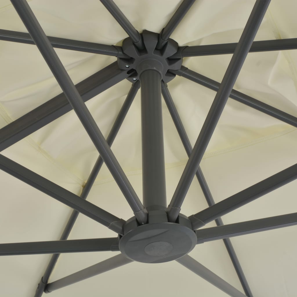 Dieser Sonnenschirm verfügt über einen starken Aluminiumrahmen, einen großen UV-beständigen Bezug und einen tragbaren Schirmständer und ist somit der perfekte Sonnenschutz. Der Gartenschirm lässt sich ganz leicht öffnen und schließen, einfach durch Drehen der Kurbel am Schirmmast. Der Aluminiummast und die 8 starken Aluspeichen machen den Balkonschirm sehr langlebig. Das exklusive Design dieses Sonnenschirms ermöglicht es dir, ihn zu neigen und um 360 Grad zu drehen, um die Sonnenstrahlen in jedem Winkel abzuschirmen. Darüber hinaus sorgt der große, abnehmbare Kreuzfuß aus Stahl für Stabilität, ohne zu viel Platz einzunehmen. Der Sonnenschirmständer besteht aus vier separaten Teilen und kann mit 60 Litern Wasser oder 80 kg Sand beschwert werden. Er ist ideal zum Stabilisieren von Sonnenschirmen mit Kreuzfüßen. Wenn leer, ist der Sonnenschirmständer ganz leicht, was den Transport ermöglicht.