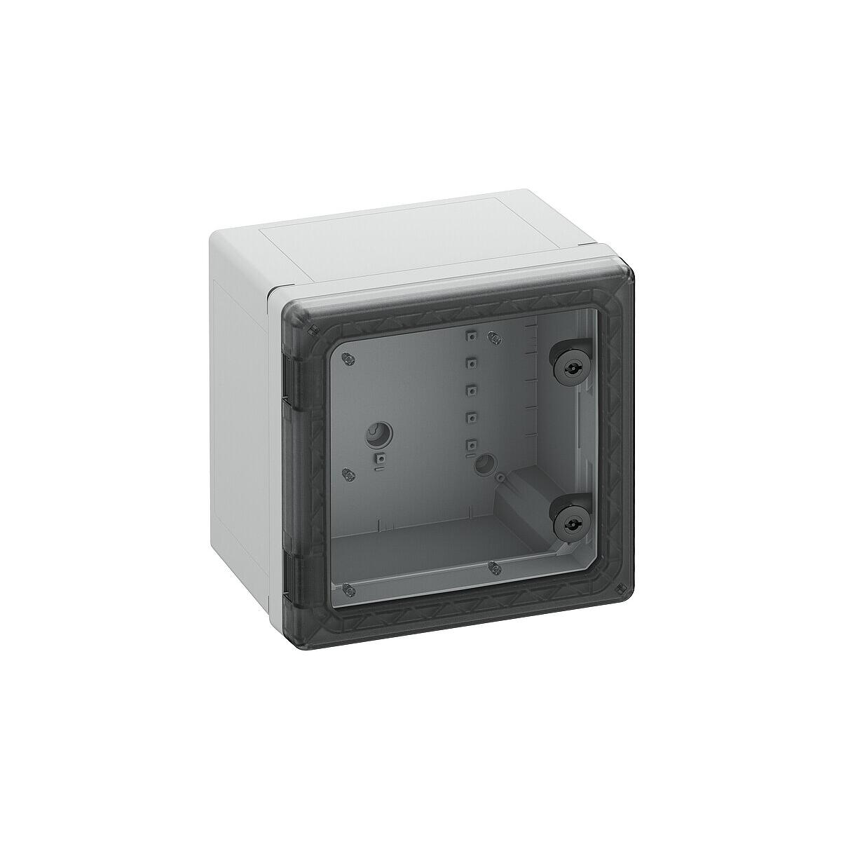 Schaltschrank - Industrie Qualität, geeignet für die Installation in rauen Umgebungen und im ungeschützten Außenbereich, Kasten und Rahmen: glasfaserverstärktes Polycarbonat, grau, ähnlich RAL 7035, Tür: Polycarbonat.