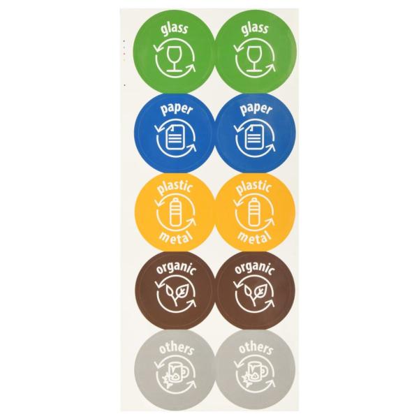 - Verfügt über Etiketten zur Abfalltrennung für jeden Behälter (Glas, Papier, Kunststoff, Biomüll, andere)