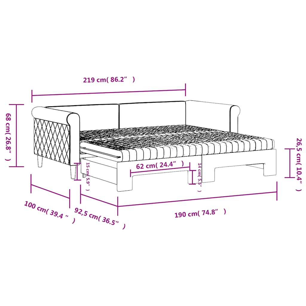 Dieses ausziehbare 2-in-1-Tagesbett, das sowohl als Sofa als auch als Bett dient, ist eine praktische und auffällige Ergänzung zu deinem Wohn- oder Schlafzimmer. Vielseitiges Tagesbett: Das Schlafsofa fungiert tagsüber als Sofa und lässt sich nachts durch Ausziehen des Rollkastens leicht in ein Doppelbett verwandeln - eine praktische Lösung, um Gästen einen bequemen Schlafplatz zu bieten und den Platz zu maximieren.Komfortable Schaumstoffmatratze: Dieses Schlafbett wird samt zwei Schaumstoffmatratzen geliefert, die für maximalen Halt und optimalen Komfort sorgen.Weicher Samt und robuste Konstruktion: Dieses Schlafsofa besitzt einen stabilen Rahmen aus Holz und Metall und ist mit weichem und bequemem Samt bezogen.Modernes Design: Das Couchbett weist ein modernes Design auf, das sich durch klare Linien, einen minimalistischen Look sowie Natürlichkeit auszeichnet und deiner Einrichtung eine moderne Note verleiht!