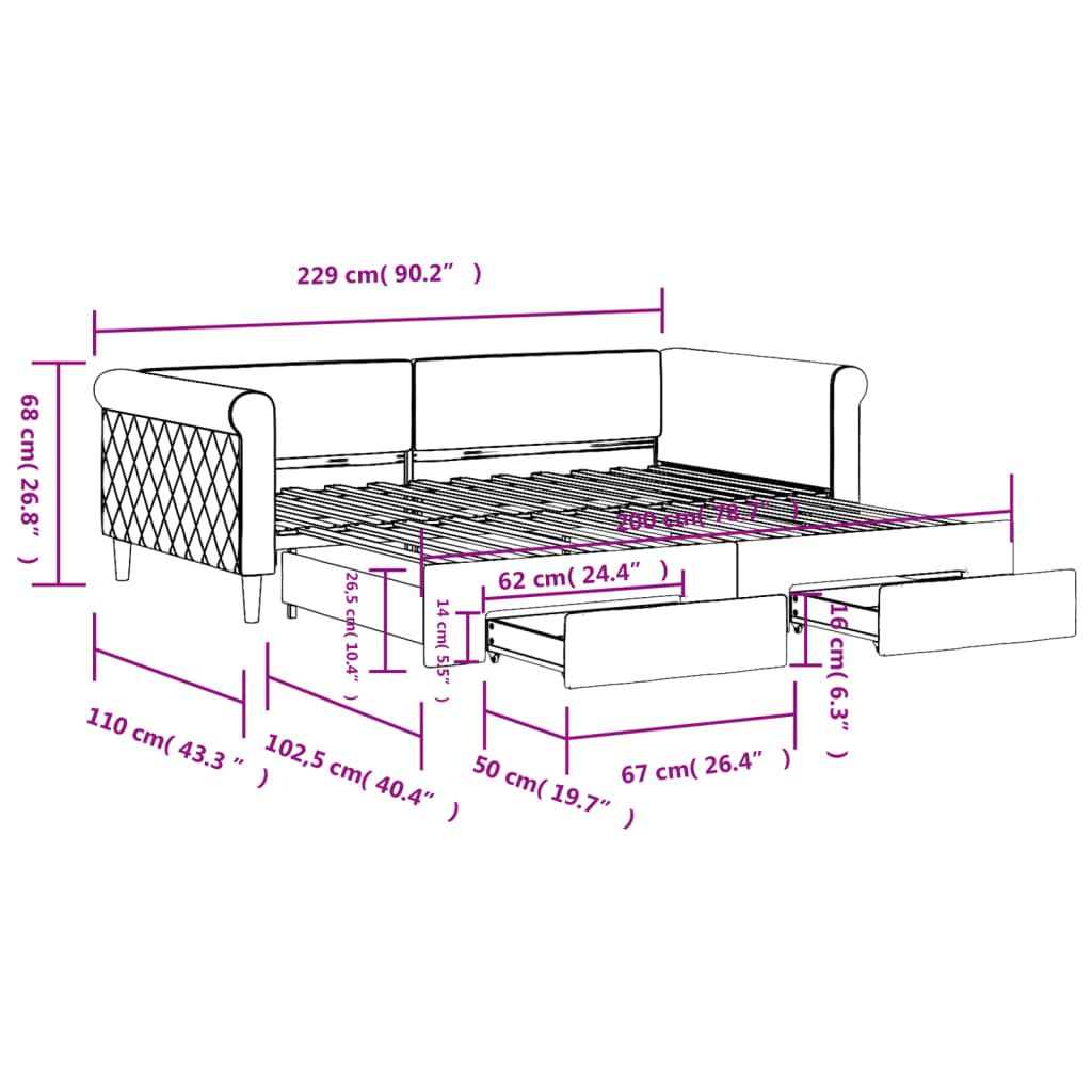 Dieses ausziehbare 2-in-1-Tagesbett, das sowohl als Sofa als auch als Bett dient, ist eine praktische und auffällige Ergänzung zu deinem Wohn- oder Schlafzimmer. Vielseitiges Tagesbett: Das Schlafsofa fungiert tagsüber als Sofa und lässt sich nachts durch Ausziehen des Rollkastens leicht in ein Doppelbett verwandeln - eine praktische Lösung, um Gästen einen bequemen Schlafplatz zu bieten und den Platz zu maximieren.Reichlich Stauraum: Dieses Gästebett verfügt über zwei Schubladen mit Rollen, die reichlich Stauraum für Kleidung, Socken, Spielzeug, Kissen usw. bieten.Weicher Samt und robuste Konstruktion: Dieses Schlafsofa besitzt einen stabilen Rahmen aus Holz und Metall und ist mit weichem und bequemem Samt bezogen.Modernes Design: Das Couchbett weist ein modernes Design auf, das sich durch klare Linien, einen minimalistischen Look sowie Natürlichkeit auszeichnet und deiner Einrichtung eine moderne Note verleiht! Gut zu wissen:Matratzen sind bei diesem Bett nicht im Lieferumfang enthalten. Wir bieten jedoch eine große Auswahl an Matratzen an. Du kannst in unserem Shop nach passenden Matratzen suchen.