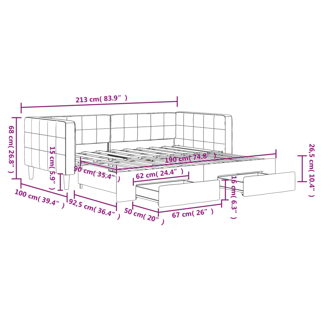 Dieses ausziehbare 2-in-1-Tagesbett, das sowohl als Sofa als auch als Bett dient, ist eine praktische und auffällige Ergänzung zu deinem Wohn- oder Schlafzimmer. Vielseitiges Tagesbett: Das Schlafsofa fungiert tagsüber als Sofa und lässt sich nachts durch Ausziehen des Rollkastens leicht in ein Doppelbett verwandeln - eine praktische Lösung, um Gästen einen bequemen Schlafplatz zu bieten und den Platz zu maximieren.Reichlich Stauraum: Dieses Gästebett verfügt über zwei Schubladen mit Rollen, die reichlich Stauraum für Kleidung, Socken, Spielzeug, Kissen usw. bieten.Weicher Samt und robuste Konstruktion: Dieses Schlafsofa besitzt einen stabilen Rahmen aus Holz und Metall und ist mit weichem und bequemem Samt bezogen.Modernes Design: Das Couchbett weist ein modernes Design auf, das sich durch klare Linien, einen minimalistischen Look sowie Natürlichkeit auszeichnet und deiner Einrichtung eine moderne Note verleiht! Gut zu wissen:Matratzen sind bei diesem Bett nicht im Lieferumfang enthalten. Wir bieten jedoch eine große Auswahl an Matratzen an. Du kannst in unserem Shop nach passenden Matratzen suchen.