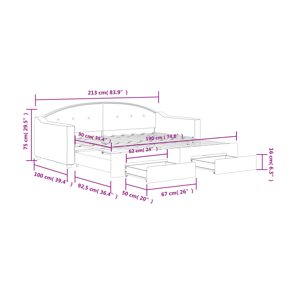 Dieses ausziehbare 2-in-1-Tagesbett, das sowohl als Sofa als auch als Bett dient, ist eine praktische und auffällige Ergänzung zu deinem Wohn- oder Schlafzimmer. Vielseitiges Tagesbett: Das Schlafsofa fungiert tagsüber als Sofa und lässt sich nachts durch Ausziehen des Rollkastens leicht in ein Doppelbett verwandeln - eine praktische Lösung, um Gästen einen bequemen Schlafplatz zu bieten und den Platz zu maximieren. Reichlich Stauraum: Dieses Gästebett verfügt über zwei Schubladen mit Rollen, die reichlich Stauraum für Kleidung, Socken, Spielzeug, Kissen usw. bieten. Strapazierfähiger Stoff und robuste Konstruktion: Dieses Tagesbettsofa besitzt einen stabilen Rahmen aus Holz und Metall und ist mit strapazierfähigem und bequemem Stoff bezogen. Gut zu wissen:Die Matratzen sind nicht im Lieferumfang dieses Bettes enthalten. Wir bieten jedoch eine große Auswahl an Matratzen an. Du kannst in unserem Shop nach passenden Matratzen suchen.