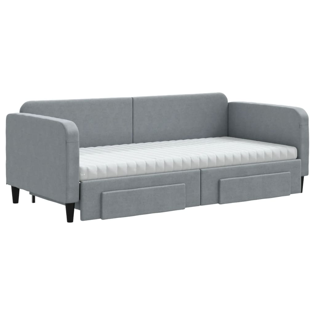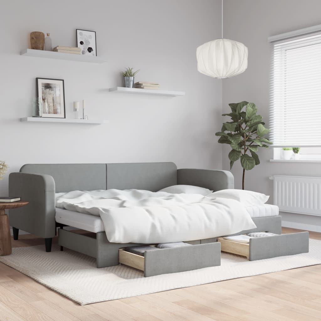 Dieses ausziehbare 2-in-1-Tagesbett, das sowohl als Sofa als auch als Bett dient, ist eine praktische und auffällige Ergänzung zu deinem Wohn- oder Schlafzimmer. Vielseitiges Tagesbett: Das Schlafsofa fungiert tagsüber als Sofa und lässt sich nachts durch Ausziehen des Rollkastens leicht in ein Doppelbett verwandeln - eine praktische Lösung, um Gästen einen bequemen Schlafplatz zu bieten und den Platz zu maximieren.Reichlich Stauraum: Dieses Gästebett verfügt über zwei Schubladen mit Rollen, die reichlich Stauraum für Kleidung, Socken, Spielzeug, Kissen usw. bieten.Komfortable Schaumstoffmatratze: Dieses Schlafbett wird samt zwei Schaumstoffmatratzen geliefert, die für maximalen Halt und optimalen Komfort sorgen.Strapazierfähiger Stoff und robuste Konstruktion: Dieses Tagesbettsofa besitzt einen stabilen Rahmen aus Holz und Metall und ist mit strapazierfähigem und bequemem Stoff bezogen.