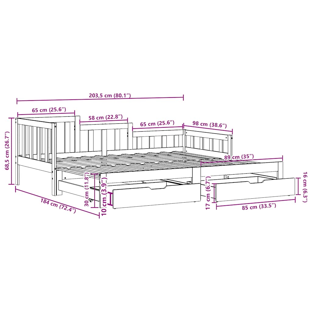 Dieses ausziehbare 2-in-1-Tagesbett, das sowohl als Sofa als auch als Bett dient, ist eine praktische und auffällige Ergänzung zu deinem Wohn- oder Schlafzimmer. Vielseitiges Tagesbett: Das Schlafsofa fungiert tagsüber als Sofa und lässt sich nachts durch Ausziehen des Rollkastens leicht in ein Doppelbett verwandeln - eine praktische Lösung, um Gästen einen bequemen Schlafplatz zu bieten und den Platz zu maximieren.Stabiles und langlebiges Gestell: Massives Kiefernholz ist für seine Stärke und Haltbarkeit bekannt. Seine gerade Maserung und die charakteristischen Aststellen tragen zu seinem rustikalen Charme bei.Latten für optimale Unterstützung: Das Sofabett ist mit Latten ausgestattet, die deine Matratze optimal stützen und auch für Atmungsaktivität sorgen.Reichlich Stauraum: Dieses Gästebett verfügt über zwei Schubladen, die reichlich Stauraum für Kleidung, Socken, Spielzeug, Kissen usw. bieten. Gut zu wissen:Matratzen sind bei diesem Bett nicht im Lieferumfang enthalten. Wir bieten jedoch eine große Auswahl an Matratzen an. Du kannst in unserem Shop nach passenden Matratzen suchen.