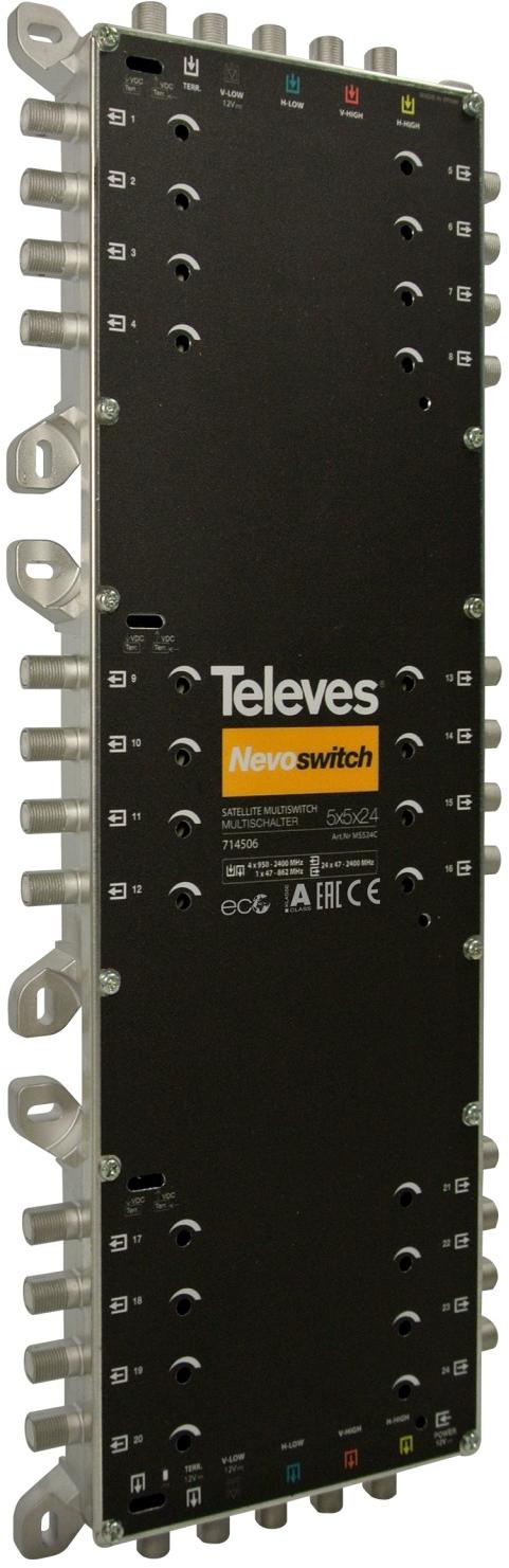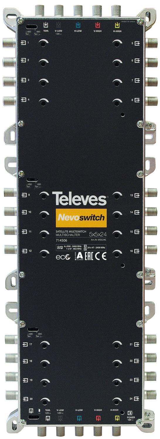 Kaskadierbarer Multischalter mit 5 Eingängen (1 x Terrestrik und 4 x SAT), 24 Teilnehmerausgänge, 5 Durchschleifausgänge und einen 12db Pegelsteller an den Teilnehmerausgängen.