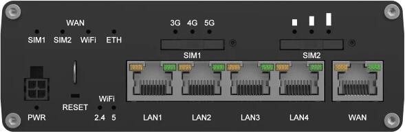 - Status-LEDs: 4 x WAN-Status-LEDs, 3 x Mobilfunkverbindungstyp, 3 x Mobilfunkverbindungsstärke, 8 x LAN-Status, 1 x Stromversorgung, 2 x 2,4G und 5G WLAN, 2 x WAN-Status