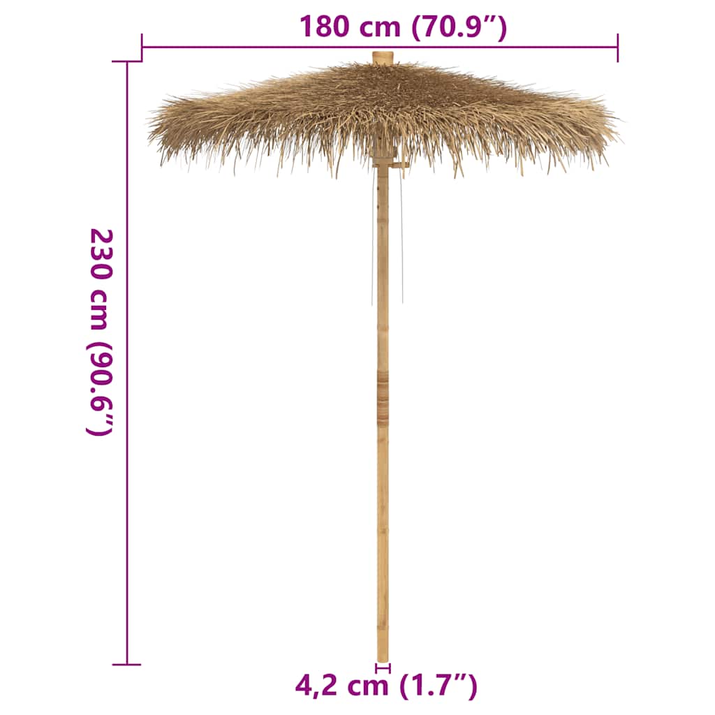 Dieser Tiki-Schirm ist mit einem Bananenblattdach ausgestattet und eignet sich perfekt als Schattenspender im Freien und verleiht deinem Außenbereich tropischen Glanz. Langlebige Materialien: Hergestellt aus natürlichem Bambus und Bananenblatt für Langlebigkeit, blockiert dieser Sonnenschirm UV-Strahlen und spendet Schatten für lang anhaltenden Komfort im Freien.Robuste Konstruktion: Dieser Gartenschirm wird von einer robusten Stange und Rippen getragen, sodass er auch an windigen Tagen an Ort und Stelle bleibt.Einfach zu bedienen: Mit seinem manuellen Seilzugsystem lässt sich dieser Gartenschirm einfach öffnen und schließen. Setze ihn direkt in einen Tisch mit Schirmloch ein oder kombiniere ihn mit einem geeigneten Standfuß (nicht im Lieferumfang enthalten) für eine stabile Nutzung.Breite Anwendungen: Dieser Sonnenschirm im hawaiianischen Stil ist langlebig und stilvoll und passt in jeden Außenbereich wie Terrasse, Garten, Strand, Pool usw. und kann sogar als Dekoration für Themenbars und Cafés verwendet werden. Gut zu wissen:Das Dach des Schirms ist handgeflochten und spendet einen Teil des Schattens, blockiert aber nicht 100 % der Sonneneinstrahlung.