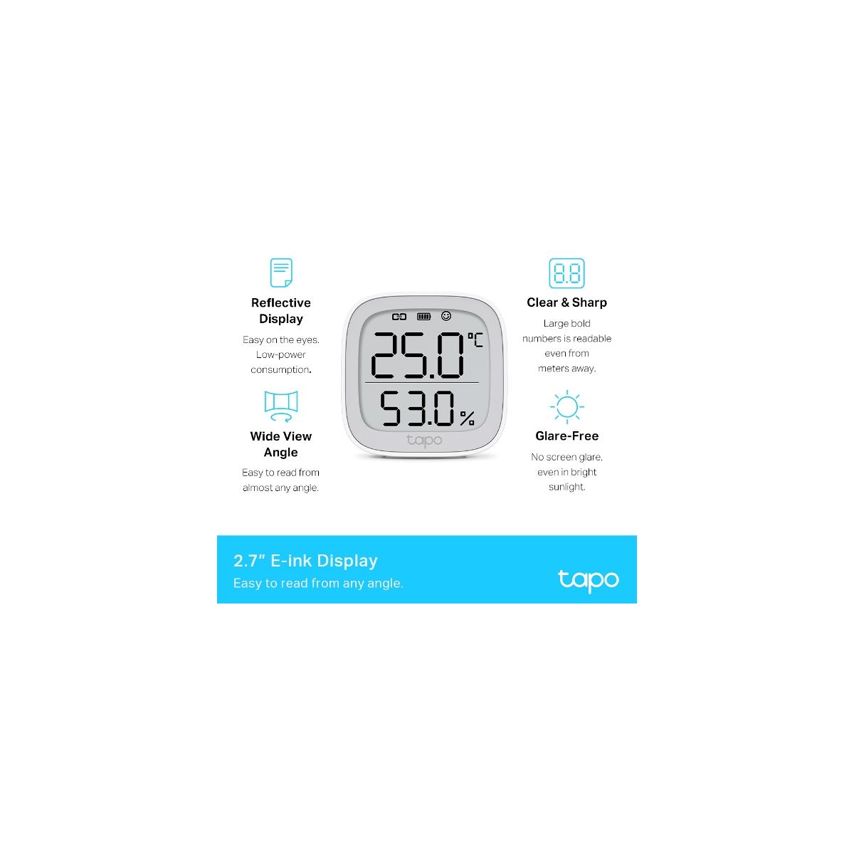 2.7" E-Ink Display - Zeigt Temperatur und Luftfeuchtigkeit, Komfortstufe mit Gesichtsausdruck, Batteriezustand und Signal an.