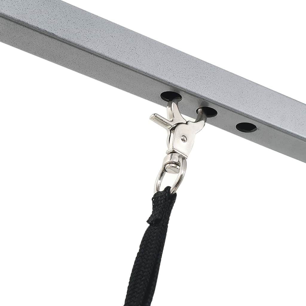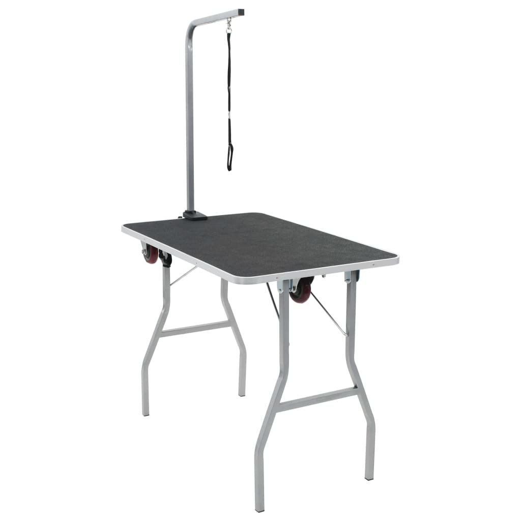 Dieser portable Trimmtisch ist sowohl für den privaten als auch mobilen Einsatz geeignet. Der professionelle, verstellbare Trimmtisch ermöglicht Ihnen, Ihren pelzigen Freund individuell in den unterschiedlichsten Positionen fürs Baden, Trimmen, Trocknen, Pflege usw. zu fixieren. Er verfügt über eine rutschfeste Tischplatte und einen pulverbeschichteten Eisenrahmen mit einem verstellbaren Trimmgalgen und Schlaufe. Die Tischplatte mit rutschfestem Gummibelag ist weich und sicher für Ihre Haustiere. Die verstellbare Schlaufe hält Haustiere auf sichere Weise zurück und verfügt über einen verbesserten Verschluss. Zusätzlich kann der Trimmgalgen bei Nichtbenutzung leicht demontiert werden, für platzsparende Lagerung und einfachen Transport. Abgesehen davon besitzt der Trimmtisch Rollen, um leicht transportiert werden zu können. Ein Montagewerkzeug ist im Lieferumfang enthalten.