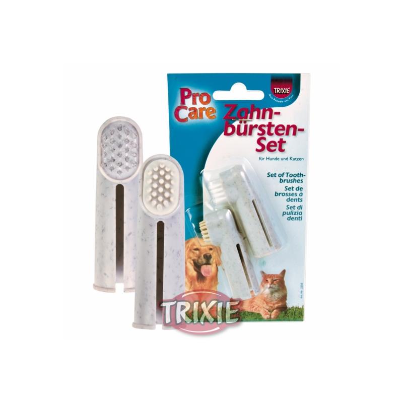Dieses Set enthält je eine Zahn und eine Massagebürste. Die einfache Handhabung erleichtert das Reinigen der Hundezähne. Regelmäßiges Putzen der Zähne sowie die Massage des Zahnfleisches beugen der Zahnsteinbildung und damit der krankhaften Entzündung des Zahnfleisches vor. Inhalt: 1 Zahnbürste, 1 Zahnfleisch Massagebürstefür die einfache Pflege von Hunde und KatzenzähnenAnwendung:Sowohl die Zahn als auch die Massagebürste werden einfach über den Finger gestülpt. Bürsten und massieren Sie Zähne und Zahnfleisch mit kreisenden Bewegungen. Vor jeder Anwendung sollten die Bürsten mit Wasser befeuchtet werden. Die Anwendung von Zahnpflegemitteln gibt frischen Atem.ProCare ZahnpflegeEin besonders wichtiges Thema ist die Zahnpflege. Regelmäßiges Putzen der Zähne mit Zahncreme beugt Zahnstein vor, verbessert die Maulhygiene und hält den Atem länger frisch und sauber. Bei der Gewöhnung an das Zähneputzen gibt es folgende Punkte zu beachten: Zu Beginn sollte der Hund sich an den Geschmack der Zahncreme gewöhnen. Bei wählerischen Hunden anfänglich etwas Zahncreme auf einen Hundekeks geben und verfüttern. Später wird dem Hund die Zahncreme seitlich auf die Zähne und das Zahnfleisch gestrichen. Der nächste Schritt zur Gewöhnung an das Zähneputzen ist das vorsichtige Massieren der Lefzen von außen. Erst danach beginnt das eigentliche Zähneputzen. Das Verschlucken der Zahncremes ist völlig unbedenklich für den Hund.Inverkehrbringer: TRIXIE Heimtierbedarf GmbH & Co. KG, Industriestraße 32, 24963 Tarp, Tel.: 04638/2109100, E-Mail: kontakt@trixie.de