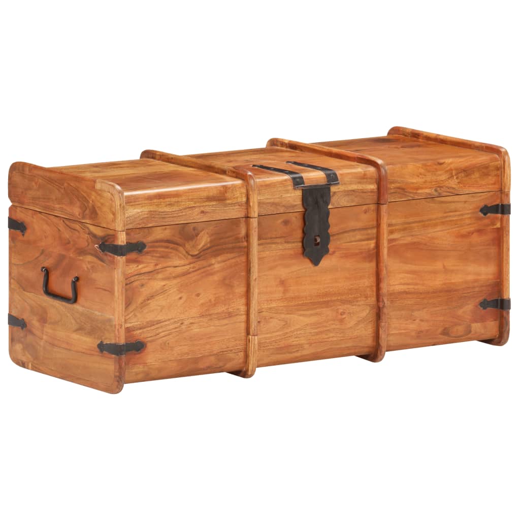 Die Holztruhe verleiht deiner Inneneinrichtung ein schlichtes Aussehen und bietet reichlich Stauraum für Kleidung, Zeitschriften, Bücher, Werkzeuge und andere Sachen. Diese Aufbewahrungstruhe besteht aus massivem Akazienholz und ist daher robust und langlebig. Sie hat vorne eine Sicherheits-Überfalle für ein Vorhängeschloss und zwei seitliche Griffe für den einfachen Transport. Diese Holztruhe mit ihrem robusten, flachen Deckel kann auch als Tisch genutzt werden. Die handwerkliche Verarbeitung und die schönen Holzmaserungen machen jedes Möbelstück zu einem Unikat. Wichtiger Hinweis: Farbe und Maserung können von Stück zu Stück variieren, was jedes Möbelstück einzigartig macht. Die Lieferung erfolgt nach dem Zufallsprinzip, was die Exklusivität und Individualität deines Produkts gewährleistet.