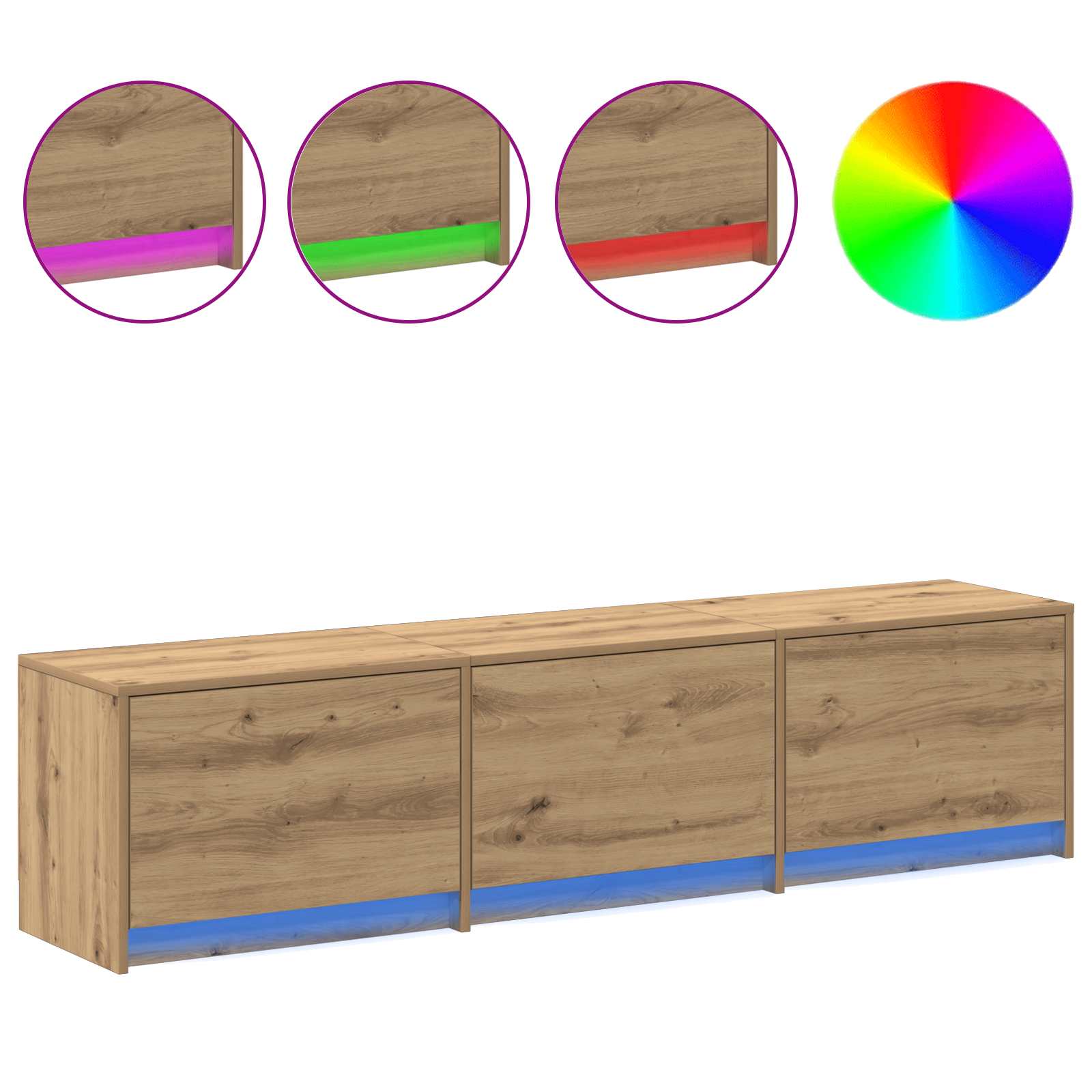 Dieser moderne TV-Schrank ist eine schicke Ergänzung für jedes Wohnzimmer. Mit einem coolen Mix aus aktuellem Stil und praktischen Aspekten ist er die perfekte Lösung für all deine TV- und Medienstauräume. Das einfache, geradlinige Design mit rustikaler Note verleiht ihm seinen besonderen Charme. Konstruktion aus Holzwerkstoff Hergestellt aus robustem Holzwerkstoff, bietet dieser TV-Schrank Langlebigkeit und Stabilität. Der solide Rahmen sorgt für Sicherheit und die modernen Akzente verleihen deinem Raum Eleganz. Pflegeleicht und für den täglichen Gebrauch geeignet, ist er die zuverlässige Wahl für dein Zuhause. Praktische Aufbewahrung Mit Regalen und Fächern hat dieser Schrank jede Menge Platz für deine Medientechnik, Bücher und Dekoartikel. Das schlichte Regal-Design ermöglicht vielseitige Aufbewahrung und hält dein Wohnzimmer ordentlich. Rustikales Design Das rustikale Design mit klaren Linien und wenig Schnickschnack bringt Frische und Charme in dein Wohnzimmer. Die schöne Materialkombination fügt Wärme hinzu und passt in zahlreiche Einrichtungsstile. Flexible LED-Beleuchtung Mit flexiblen LED-Streifen beleuchtet, sorgt dieser Schrank für stimmungsvolle Lichtakzente, die du einfach per Fernbedienung steuern kannst. Die bunten Lichter schaffen eine anpassbare Atmosphäre, ideal für jede Stimmung im Wohnzimmer. Einfache Pflege Der Schrank braucht nur ein bisschen Aufmerksamkeit: ein trockenes Tuch zum Putzen reicht völlig. Vermeide aggressive Chemikalien, damit er lange wie neu aussieht. Die pflegeleichten Hinweise machen den Umgang damit super einfach.