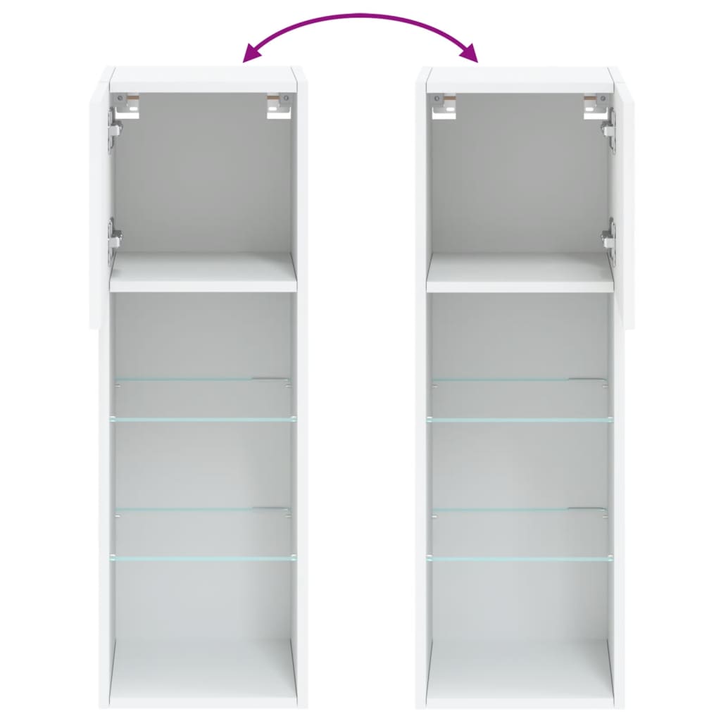 Mit ihrem trendigen und dennoch praktischen Design werden diese TV-Schränke mit LED-Leuchten echte Hingucker in deinem Zimmer sein. Langlebiges Material: Holzwerkstoff ist ein Material von außergewöhnlicher Qualität mit glatter Oberfläche, das sich durch Festigkeit, Stabilität und Feuchtigkeitsbeständigkeit auszeichnet. Aus Holzwerkstoff gefertigt, sind diese TV-Schränke robust und langlebig.Reichlich Stauraum: Die TV-Schränke bieten reichlich Stauraum, um DVD-Player, Empfänger, CDs und andere Kleinigkeiten gut organisiert und in Reichweite aufzubewahren.RGB-LED-Leuchten: Diese TV-Schränke sind mit RGB-LED-Leuchten ausgestattet, die über verschiedene Menüs verfügen, um die Farbe der Lichter zu wechseln und sie automatisch einzustellen.Wandmontage: Diese TV-Schränke lassen sich an der Wand montieren, um zusätzlichen Stauraum zu schaffen. Auf diese Weise kannst du deine Bodenfläche maximieren und für Ordnung im Raum sorgen. Gut zu wissen:Schrauben und Dübel für die Innenseite der Wand sind nicht enthalten. Wir empfehlen dir, Schrauben und Dübel zu finden und zu verwenden, die speziell für deine Wände geeignet sind. Wenn du dir nicht sicher bist, kannst du dich an einen Fachmann wenden. Bitte lies und befolge jeden Schritt in der Anleitung.Das Produkt verfügt über einen USB-Anschluss, für den eine zertifizierte 5V-USB-Stromquelle erforderlich ist (nicht im Lieferumfang enthalten).