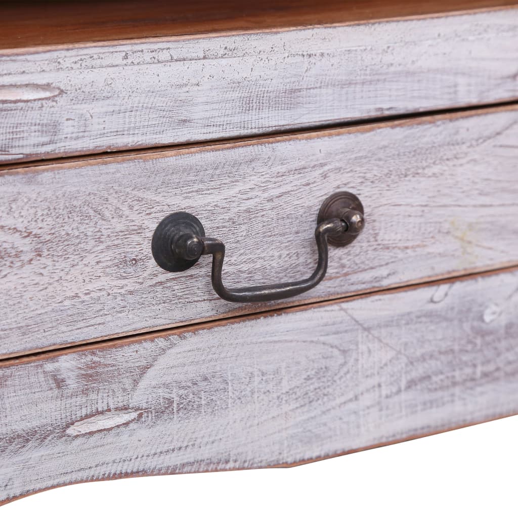 Verleihen Sie Ihrer Inneneinrichtung einen Hauch von Rustikalität mit diesem TV-Schrank aus Holz! Der TV-Schrank im Antik-Stil besteht aus massivem Altholz, das aus umgestürzten Bäumen, alten Booten, sowie Böden und Stützbalken von alten abgerissenen Gebäuden stammt. Es kann aus verschiedenen Holzarten wie Mahagoni, Kiefernholz, Teakholz, Buche, Eiche, Zeder, Mango, Akazie, usw. bestehen. Das bedeutet, dass das Altholz die Eigenschaften dieser verschiedenen Holzarten beibehält. Das heißt aber auch, dass man Nägel- oder Schraubenlöcher, sowie andere Unvollkommenheiten vorfinden kann, welche die reiche Geschichte des Holzes erzählen und dem Möbelstück ein warmes und authentisches Aussehen verleihen. Die Handwerkskunst und die ästhetisch ansprechende Hartholzmaserung machen jedes Stück zu einem Unikat. Mit 1 großen Schublade und 1 offenen Fach hilft Ihnen der markante Stereo-Schrank dabei, Ihre Sachen in bester Ordnung zu halten. Der Artikel ist bereits montiert; keine Montage ist erforderlich. Wichtiger Hinweis: Die Holzmaserung und Farbe variieren von Stück zu Stück, so dass jeder dieser Schränke einzigartig ist. Die Lieferung erfolgt nach dem Zufallsprinzip.
