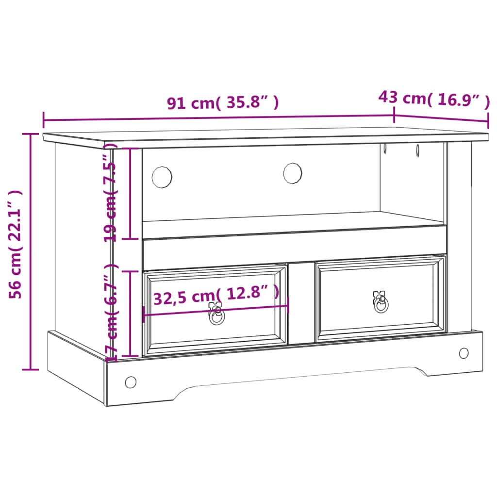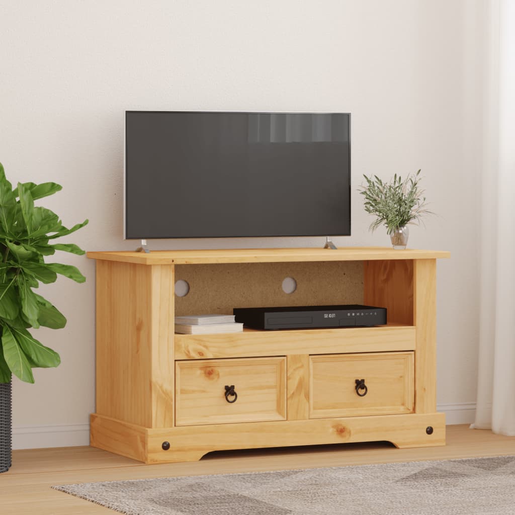 Dieser hochwertige Fernsehschrank aus Holz ist ein Möbelstück im mexikanischen Corona-Stil. Das gewachste Kiefernholz versprüht einen rustikalen, mexikanischen Charme, der den Holzschrank zu einer großartigen Ergänzung für Ihr Wohnzimmer macht. Dieser robuste TV-Schrank ist aus massivem Kiefernholz gefertigt. Die robuste Oberplatte bietet eine stabile und sichere Oberfläche, auf der Sie Ihren Fernseher, einen Obstkorb, eine Vase oder andere dekorative Gegenstände aufstellen können. Dieser Fernsehschrank verfügt über zwei Schubladen und ein Regalfach und bietet somit ausreichend Platz für Ihre Multimedia-Geräte, Bücher und verschiedene andere Gegenstände. Auf der Rückseite befindet sich eine Öffnung für die Kabel. Der Zusammenbau ist kinderleicht.