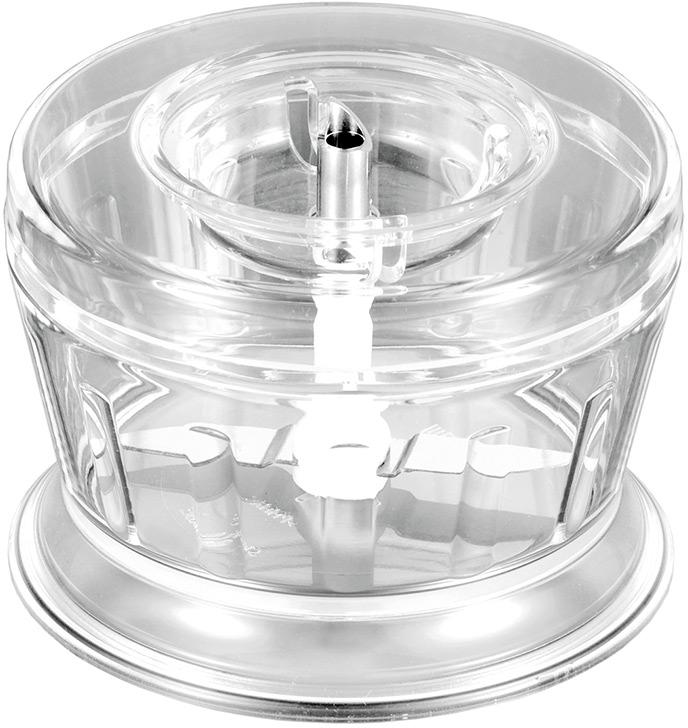 Das zweiflügelige Edelstahlmesser zerkleinert alles ratzfatz und durch den unter dem Behälter angebrachten Gummiring hat der Zerkleinerer sicheren Stand, da verrutscht auch bei hoher Drehzahl nichts. Nach dem Einsatz wird das Messer ganz einfach zur Reinigung entnommen, bequemer geht?s nicht!
