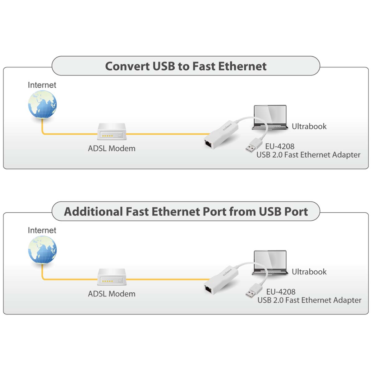 Der Edimax EU-4208 ist ein kompakter USB-Fast-Ethernet-Adapter für ein Ultrabook oder Macbook Air ohne Ethernet-Anschlüsse oder für Desktops und Notebooks, die einen zusätzlichen Fast-Ethernet-Anschluss benötigen.