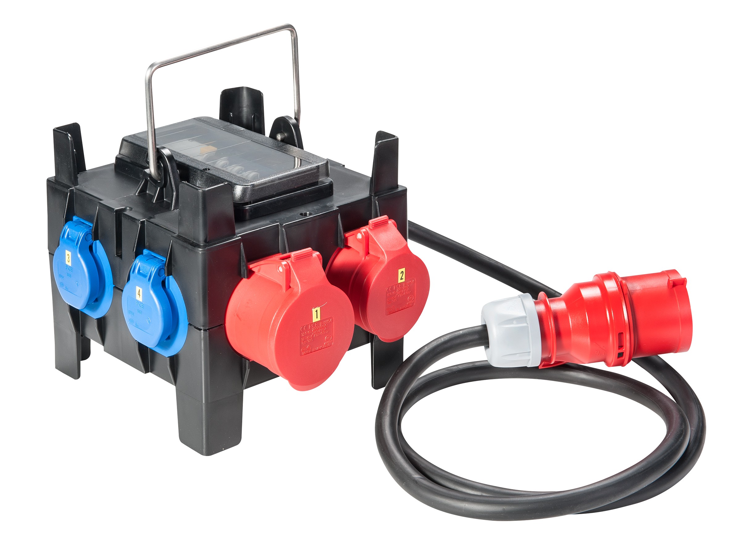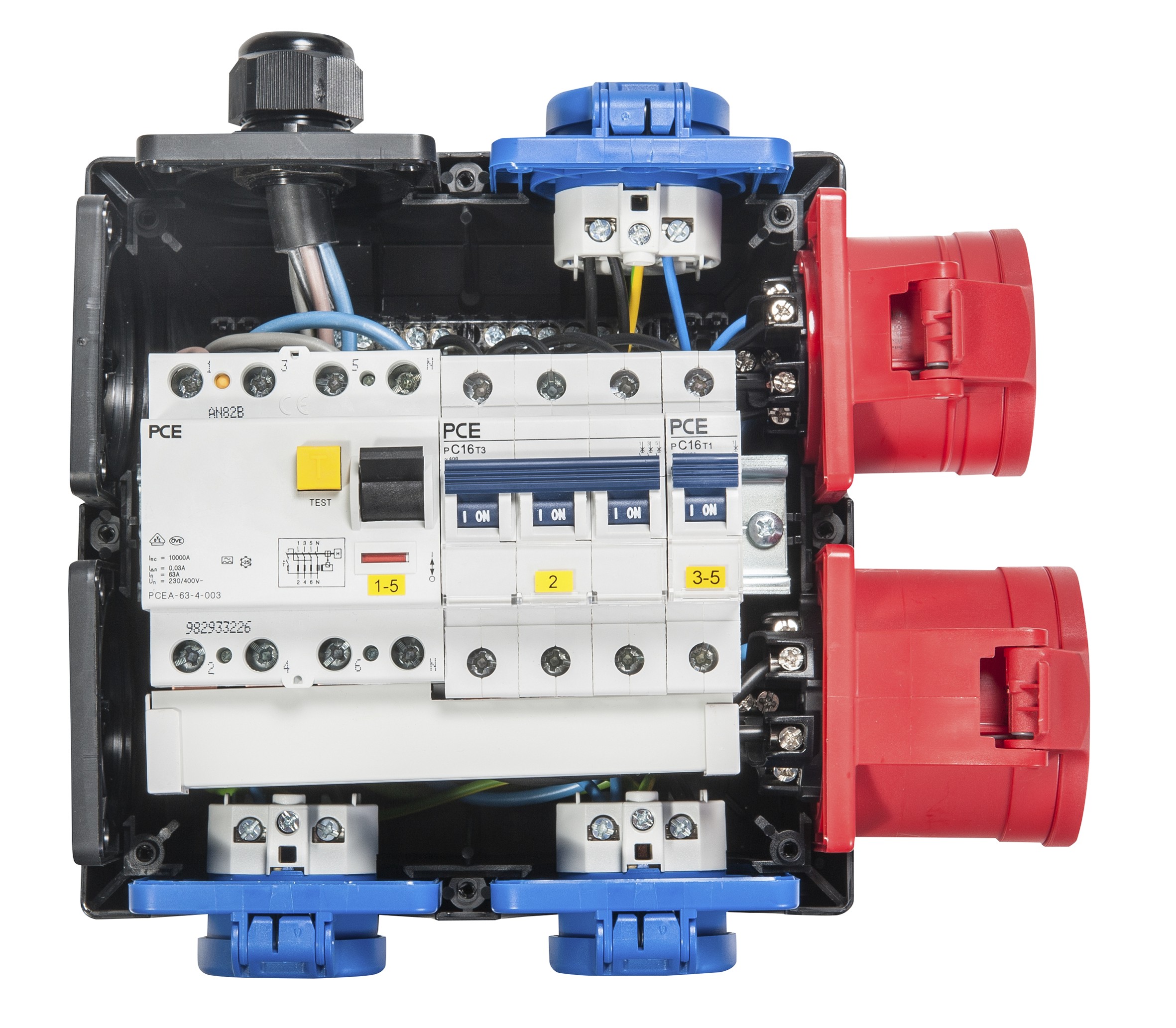 - die Schutzschaltgeräte sind unter einer transparenten, schlagfesten Polycarbonatabdeckung eingebaut