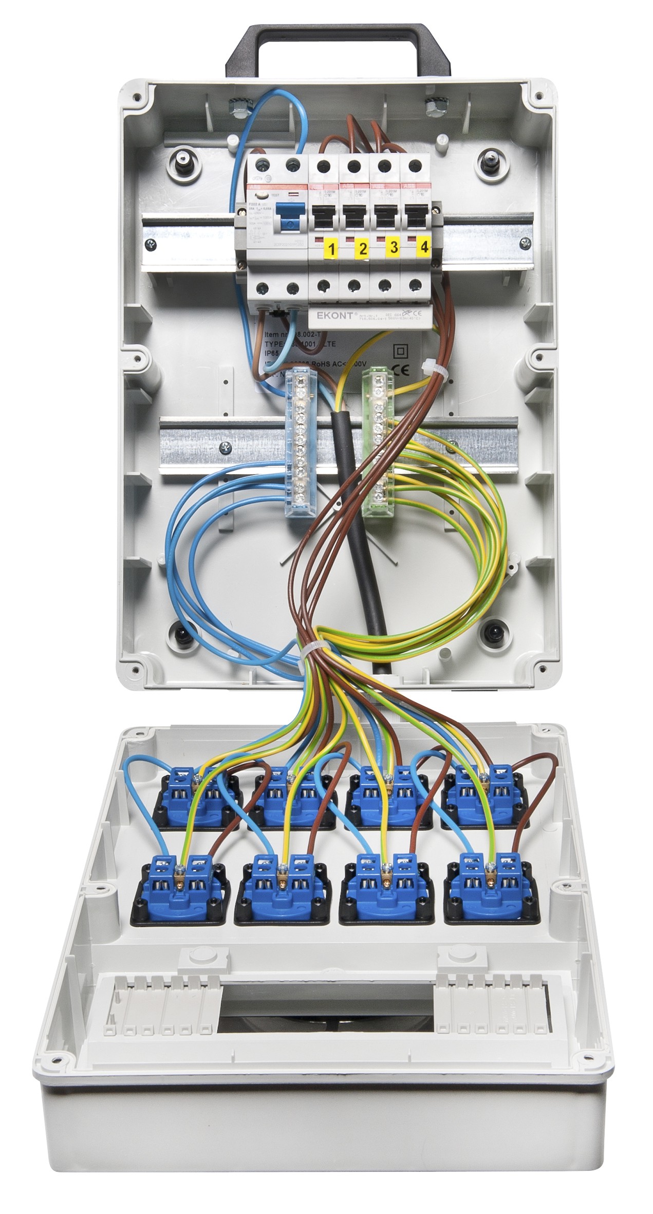 - die Schutzschaltgeräte sind unter einer transparenten, schlagfesten Polycarbonatabdeckung eingebaut
