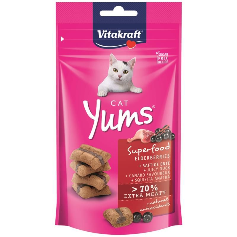Mhmmm ... yummy! Die extra fleischigen Cat Yums Superfood Holunder und delikater Ente werden in einem einzigartigen Verfahren hergestellt.Mit besten Zutaten sowie ohne Zusatz von Zucker, Getreide und Soja. Das Besondere: Jedes Snack-Häppchen ist verfeinert mit heimischer Holunderbeere. Diese ist von Natur aus reich an Antioxidantien und daher gut für den Zellschutz. Ein richtiger Power-Snack für Katzen!Schonend im Ofen gegart und mit herzhaft fruchtiger Füllung sind die Cat Yums nicht nur unwiderstehlich lecker, sondern auch schön saftig beim Hineinbeißen. Ihre Katze wird diese fleischigen Snacks lieben!- Saftige Katzensnacks mit sichtbarer Füllung- Extra fleischig und mit saftiger Ente- Verfeinert mit Holunderbeere- Schonend im Ofen gegart- Zuckerfreie Rezeptur- Ohne Getreide, ohne Soja- Im wiederverschließbarem BeutelZusammensetzung:Fleisch und tierische Nebenerzeugnisse 70,4% (Ente 2,9%, Geflügel), Gemüse, Pflanzliche Nebenerzeugnisse (aus Kartoffel, Erbse, Glycerin, Pulvercellulose), Mineralstoffe, Hefen, Früchte (Holunderbeersaftkonzentrat 1%).Inhaltsstoffe:38,0% Feuchtigkeit, 20,0% Protein, 12,0% Fettgehalt, 1,5% Rohfaser, 7,5% Rohasche.Zusatzstoffe/kgErnährungsphysiologische Zusatzstoffe:445mg 3a370 TaurinMit Antioxidations- und Konservierungsmittel.Mit Farbstoffen:aDENI361007.Fütterungsempfehlung:Zum Verwöhnen zwischendurch.Wir empfehlen für Katzen mit einem Idealgewicht von … 3 kg: max. 3 Stück/Tag 4 kg: max. 4 Stück/Tag 5-6 kg: max. 5 Stück/Tag 7-8 kg: max. 6 Stück/TagEs handelt sich um Richtwerte, die je nach Alter, Aktivität und Rasse variieren können. Berücksichtigen Sie die verfütterte Menge bei der Tagesration und stellen Sie immer ausreichend Trinkwasser bereit.Inverkehrbringer: Vitakraft pet care GmbH & Co. KG, Mahndorfer Heerstr. 9, 28307 Bremen, Tel.: 0421/48960, E-Mail: info@vitakraft.de