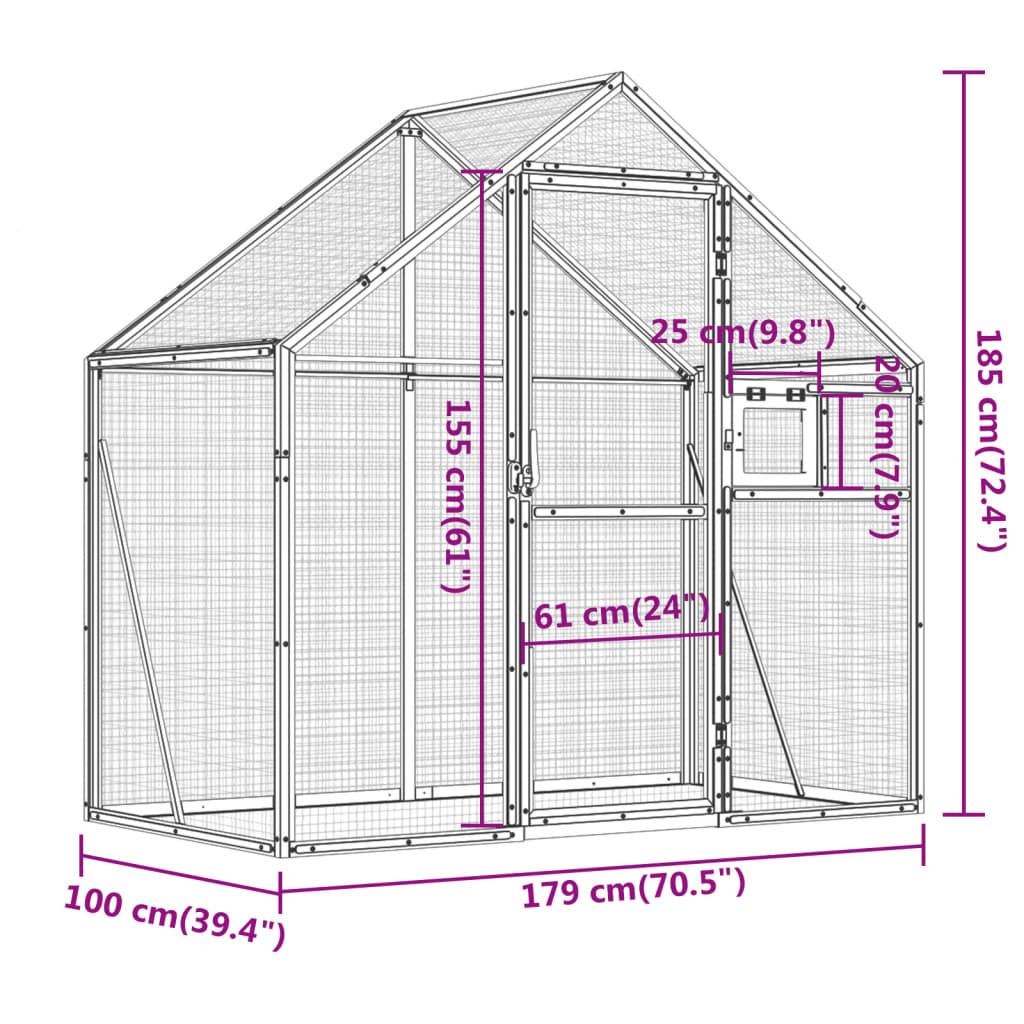 Diese Voliere bietet deinen Vögeln einen gemütlichen und komfortablen Platz zum sicheren Fliegen und Spielen. Stabiler Rahmen: Aluminium-Metall ist leicht und stabil. Es ist korrosionsbeständig und besitzt eine selbstschützende Oxidschicht. Dank der robusten Aluminiumkonstruktion ist diese Vogelvoliere auf eine lange Lebensdauer ausgelegt.Maschendraht: Der Vogelkäfig ist mit Maschendraht versehen, um Unfug und unerwartete Unfälle zu verhindern. Zudem kannst du deine Vögel täglich beobachten, während die Vögel ein breites Sichtfeld und reichlich frische Luft genießen.Große Bewegungsfreiheit: Die Voliere bietet deinen Vögeln reichlich Bewegungsfreiheit zum Herumlaufen, Spielen und Herumfliegen. Zudem ist sie auch für andere Kleintiere wie Kaninchen, Enten, Hühner, Gänse usw. geeignet.Abschließbare Tür und Fenster: Die abschließbare Flügeltür mit Riegel sorgt für zusätzliche Sicherheit und bietet deinen Vögeln zusätzlichen Schutz. Der große Papageienkäfig ist auch mit einem abschließbaren Fenster versehen, das die Fütterung erleichtert.