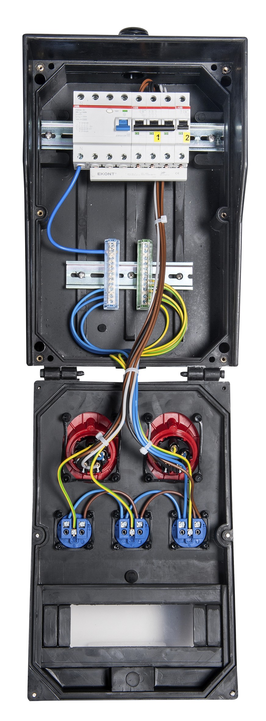 - die Schutzschaltgeräte sind unter einer transparenten, schlagfesten Polycarbonatabdeckung eingebaut
