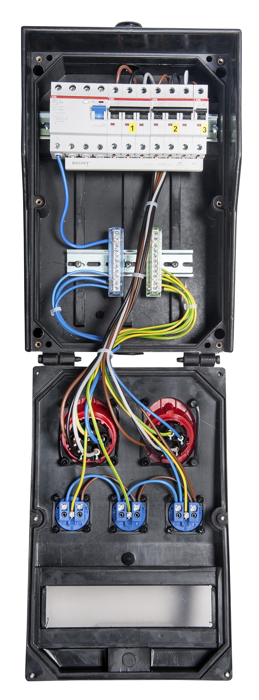 - die Schutzschaltgeräte sind unter einer transparenten, schlagfesten Polycarbonatabdeckung eingebaut
