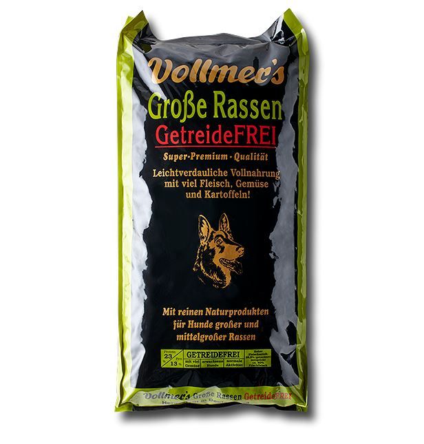 Im „Große Rassen GETREIDEFREI“ verwendet Vollmers Kartoffeln und viel Gemüse anstelle von Getreide. In Verbindung mit dem hohen Anteil an Geflügelfleisch ist diese Vollnahrung sehr bekömmlich und besonders leicht verdaulich. So ist „Große Rassen GETREIDEFREI“ optimal für ausgewachsene Hunde großer Rassen mit einer empfindlichen Verdauung geeignet.Große Hunde neigen dazu ihr Futter hinunterzuschlingen, daher wurden als Form für dieses Futter große Ringe gewählt. Der Hund zerkaut diese und reinigt so gleichzeitig seine Zähne. Sollten die Ringe doch einmal ganz geschluckt werden begünstig die Ringform eine schnellere Zersetzung des Futters durch das leichtere Eindringen der Magensäfte in das Futter. Dies kann eine bessere Verdauung gewährleisten.Hochverdauliche Geflügelfette, Leinsamen und norwegisches Lachsöl enthalten einen ausgewogenen Anteil an Omega-3 und Omega-6 Fettsäuren, welche bei Haut- und Fellproblemen helfen können, das Immunsystem stärken und Herzerkrankungen vorbeugen können. Aufgrund der Größe sind die Gelenke von Hunden großer Rassen extremen Belastungen ausgesetzt. Vollmers setzt im „Große Rassen GETREIDEFREI“ daher auf den Bio-Vital-Komplex PLUS, der aus neuseeländischer Grünlippmuschel, Glucosamin, Chondroitinsulfat, Gelatine, Kieselgur, Seealge und Kräutern besteht. So wird zur Gesunderhaltung von Knochen, Knorpeln und Gelenken beigetragen. Zusammensetzung: Kartoffelflocken, Geflügelfleisch getr. (Hähnchen-, Truthahn-, Enten- Hühnchenfleisch), Geflügelfett, Rübenschnitzel, Griebenprotein, Fleischmehl, Karottentrester, Kieselgur, Geflügelleber hydrolisiert, Gemüse (Pastinake, Spinat, Paprika, Zucchini, Luzerne, Sellerie, Brokkolie, Shiitake, Petersilie), Leinsamen, Lachsöl, Hefe, Chicoree, Johannisbrotmehl, Fischmehl, Natriumchlorid, Apfeltrester, Vollei, Seealge, Gelatine, Yuca Schidigera, Grünlippmuschel, Teufelskralle.Analytische Bestandteile: Rohprotein: 23%, Rohfett: 13%, Rohfaser: 3%, Rohasche: 7,5%, Calcium 1,5%, Phosphor 1%. Ernährungsphysiologische Zusatzstoffe je kg: 15000 I.E. Vitamin A, 1200 I.E. Vitamin D3, 50mg Vitamin E, 5mg Vitamin B1, 5mg Vitamin B2, 30mg Niacinamid, 6mg Vitamin B6, 15mg Pantothensäure, 70mg Vitamin C, 1200mg Cholinchlorid, 100mg Zink, 20mg Mangan, 10mg Kupfer, 2mg Jod, 2mg Folsäure, 0,3mg Selen, 350mcg Biotin, 40mcg Vitamin B12.Technologische Zusatzstoffe: tocopherolhaltige Extrakte aus pflanzlichen Ölen. Fütterungsempfehlung:s. Verpackung.Inverkehrbringer: Gerhard Vollmer GmbH & Co. KG, Industriestr. 13, 32139 Spenge, Tel.: 05225/3300, E-Mail: info@vollmers.de