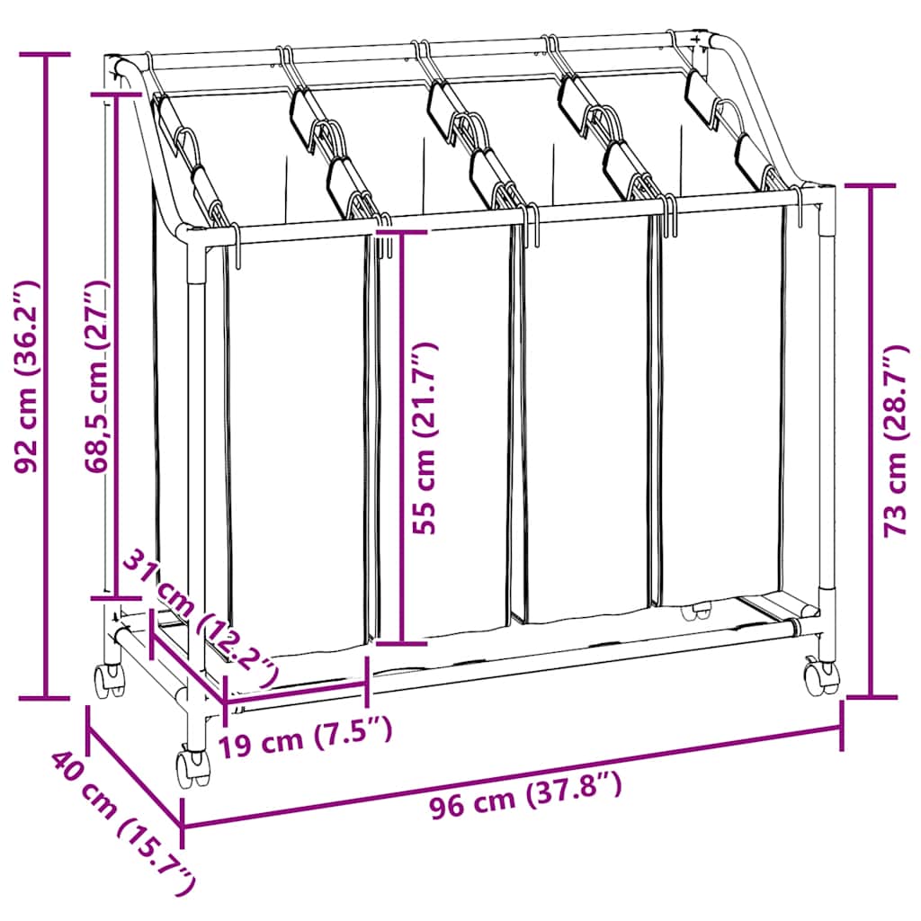 Stellen Sie sich vor, wie energiesparend und bequem es ist, schmutzige Wäsche organisiert zu halten und bequem in Ihre Waschküche zu transportieren. Unser benutzerfreundlicher Wäschekorb macht es möglich! Dieser Wäschekorb organisiert jede Waschküche, jeden Hauswirtschaftsraum und jeden Kleiderschrank und ist die perfekte Wahl, um Ihre individuellen Bedürfnisse zu erfüllen. Er verfügt über vier große Sortierbeutel, die mithilfe der Stahlgriffe zum Transport der Wäsche leicht entnommen werden können. Darüber hinaus erleichtern die Rollen und die Griffe an jedem Ende des Wagens das Verschieben. Der robuste Stahlrahmen trägt große Wäschelasten bis zu 20 kg. Das Produkt lässt sich auch einfach montieren und warten.