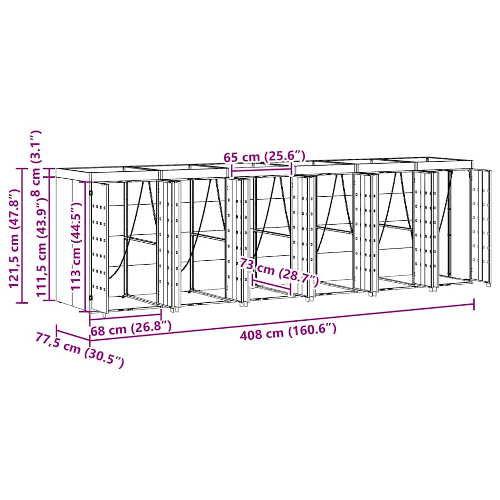 Die Mülltonnenaufbewahrung bietet eine schicke Lösung, um Abfallbehälter im Freien zu organisieren, ohne das Aussehen deines Gartens oder deiner Terrasse zu stören. Das moderne Design fügt sich perfekt in verschiedene Außenräume ein, und sie ist sowohl praktisch als auch gut aussehend. Für den Außeneinsatz gemacht, bleibt sie auch langfristig top in Schuss, während dein Raum ordentlich bleibt. Eine tolle Wahl für alle, die Wert auf Ordnung und Sauberkeit legen. Wasserabweisendes Material: Diese Mülltonnenaufbewahrung ist so gemacht, dass sie Regen und Sonne standhält, damit dein Müll trocken und sauber bleibt. Das UV-beständige Material sorgt dafür, dass die Farben und die Form auch bei jeder Witterung erhalten bleiben. Innovatives erweiterbares Design: Der Rahmen lässt sich wirklich ganz einfach anpassen, je nachdem, wie viele Mülltonnen du hast. Wenn du mehr Platz brauchst, kannst du ganz einfach andere Sektionen hinzufügen. Genial für wachsende Familien oder wenn du mehr Platz brauchst! Belüftetes Merkmal für Effizienz: Wegen der Belüftung bleibt die Luft gut zirkulieren, und das hilft, unangenehme Gerüche zu vermeiden. So bleibt alles hygienisch und angenehm, wenn du draußen bist. Stylisches modernes Design: Das moderne Design kombiniert einfache Linien mit Funktionalität. Es passt perfekt in jeden zeitgemäßen Garten oder jede Terrasse und macht alles noch schöner. Einfache Pflege & Wartung: Die Pflege ist ganz einfach; einfach mal mit einem feuchten Tuch drüberwischen, und schon sieht alles wieder neu aus. Mit diesem praktischen Zubehör wird alles noch einfacher und schöner für alle, die auf Nützlichkeit und schönes Aussehen Wert legen.