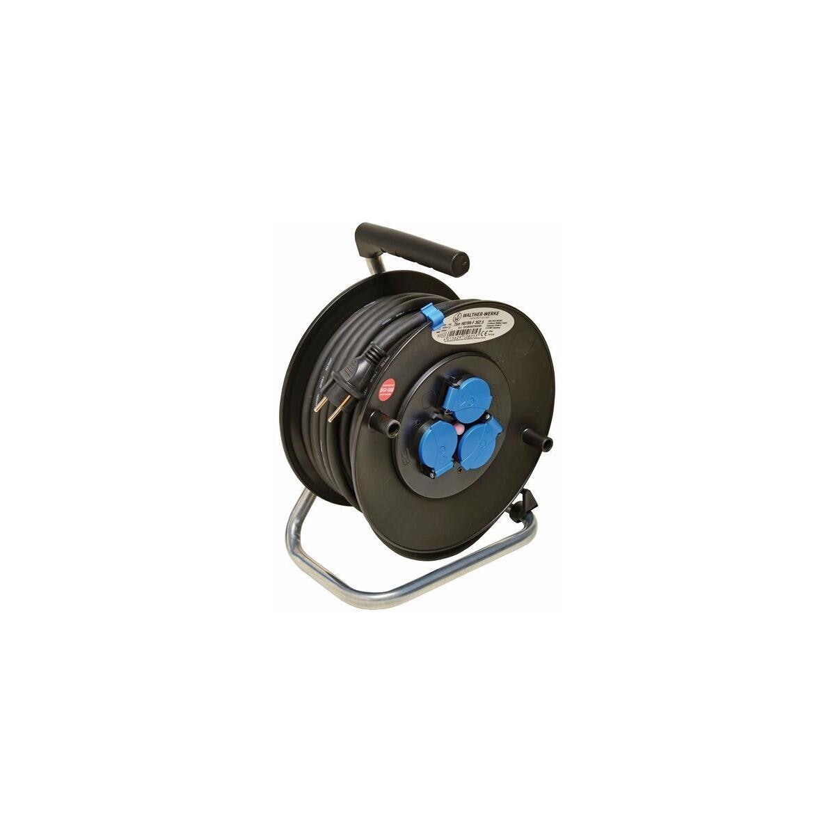 WALTHER Sicherheits-Kabeltrommel 230V mit Trommelkörper aus hochbruchfestem Spezialkunststoff stabiles, verzinktes Fußgestell mit geformten Haltegriff, Feststellbremse und Leitungsführung Gesamtschutzart: IP44 Bemessungsstrom: 16A Leistung bei aufgewickelter Leitung: 1500W Leistung bei abgewickelter Leitung: 3500W Abmessungen: 280 x 190 x 380mm (HxBxT) 285mm Durchmesser Anschluss: 25m Gummischlauchleitung H07RN-F3G2,5 mit Schutzkontaktstecker entspricht BGI608 (DGUV-I 203-006)/K2 (BGI600) "- Gewerbe, Baustelle -" Abgänge: 1 Thermoschutzschalter 3 Schutzkontaktsteckdosen 16A 3P 230V mit Klappdeckel