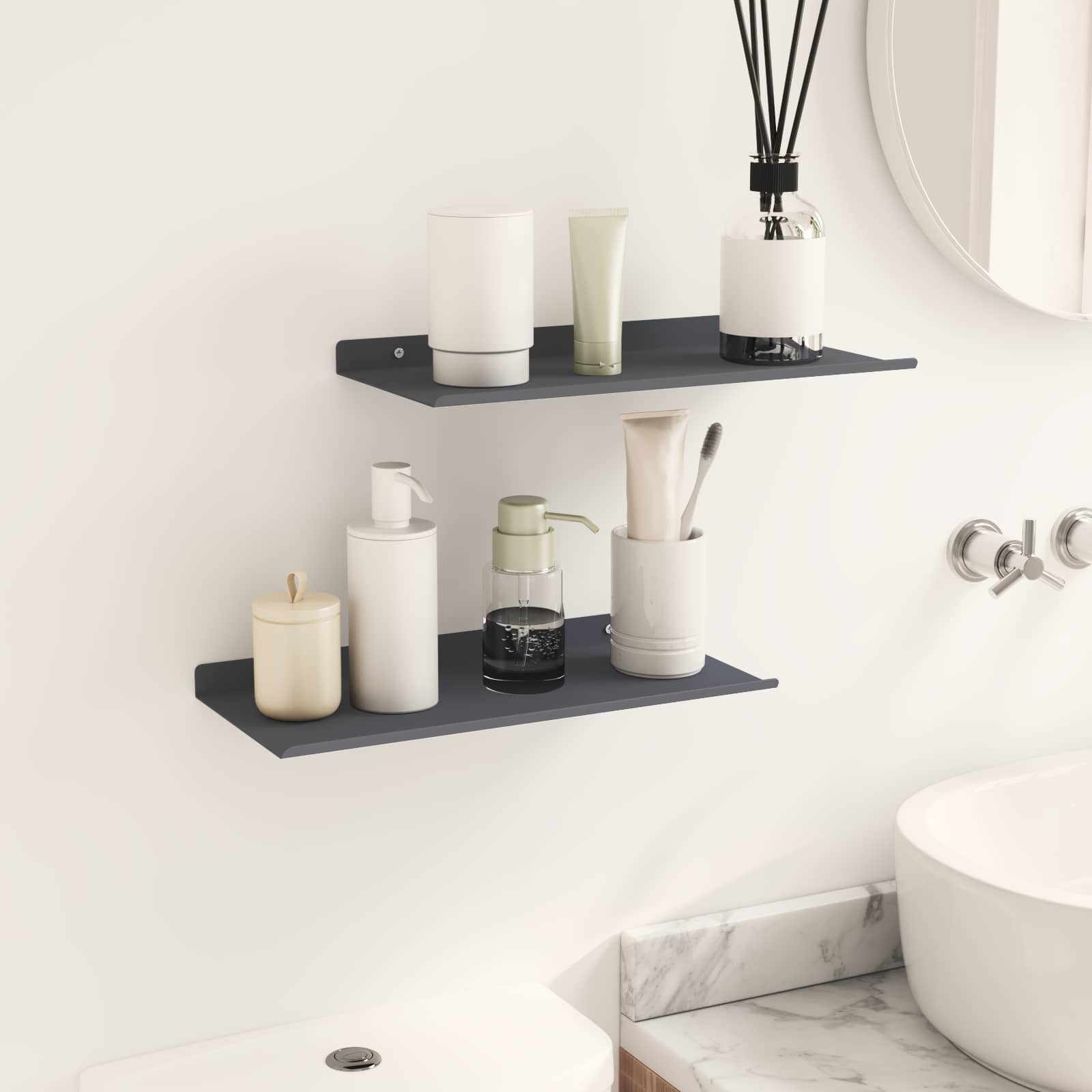 Dieses schlanke Wandregal kombiniert minimalistischen Stil mit modernem Design und ist ein echter Hingucker für jedes Zuhause. Die robuste Stahlkonstruktion und die glatte matte Oberfläche verleihen dem Regal eine elegante Note und gleichzeitig eine vielseitige Aufbewahrungslösung. Ideal für kleine Räume, hilft es den Nutzern, ihre Einrichtung zu verbessern, indem es den perfekten Platz für die Präsentation geliebter Dinge bietet. Ob im Wohnzimmer, Bad oder in der Küche ? dieses praktische Regal peppt jedes Ambiente auf und verleiht ihm eine persönliche Note. Matte Stahlkonstruktion Das Wandregal besteht aus hochwertigem Stahl und bietet eine robuste und langlebige Struktur, die täglichen Belastungen standhält, ohne dabei an Style zu verlieren. Die matte Oberfläche schafft einen modernen Look und sorgt für eine glatte, nicht reflektierende Fläche, die sich super in zeitgenössische Interieurs integriert. Wandmontiertes Design Dieses Regal ist praktisch konzipiert und spart wertvollen Platz auf dem Boden, während es genug Stauraum bietet. Ideal für viele Räume, von Wohnbereichen bis hin zu Küchen, schafft es ein ordentliches und stilvolles Zuhause. Einfache Installation Das mitgelieferte Zubehör macht die Montage mit einfachen Haushaltswerkzeugen kinderleicht. Es wird empfohlen, zu zweit zu arbeiten, um sicherzustellen, dass das Regal fest sitzt, sodass du schnell und effizient dein gewünschtes Layout gestalten kannst. Vielseitige Nutzung Dieses Regal mit erhöhten Kanten ist perfekt für verschiedene Szenarien und eignet sich zur Ablage von Büchern, Vasen oder Toilettenartikeln. Regelmäßiges Abstauben mit einem feuchten Tuch hält das Regal frisch und sauber, ohne aggressive Reiniger zu benutzen, was es zu einem unauffälligen, aber effektiven Accessoire für dein Zuhause macht. Mühelose Pflege Die Pflege des eleganten Wandregals ist super einfach: Wische einfach ab, um Staub zu entfernen, und vermeide aggressive chemische Reinigungsmittel, um die Oberfläche zu schonen. Diese einfache Pflege-Routine sorgt für langfristige Freude und frisches Aussehen.