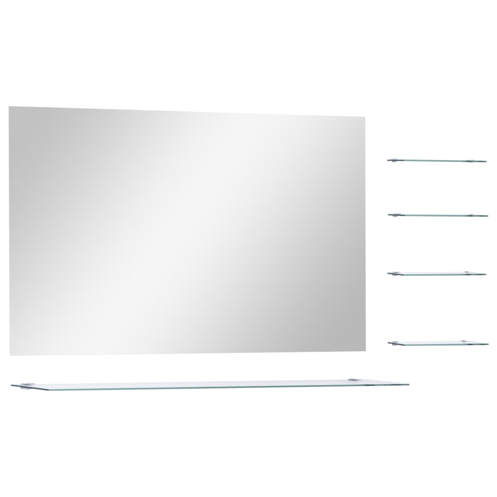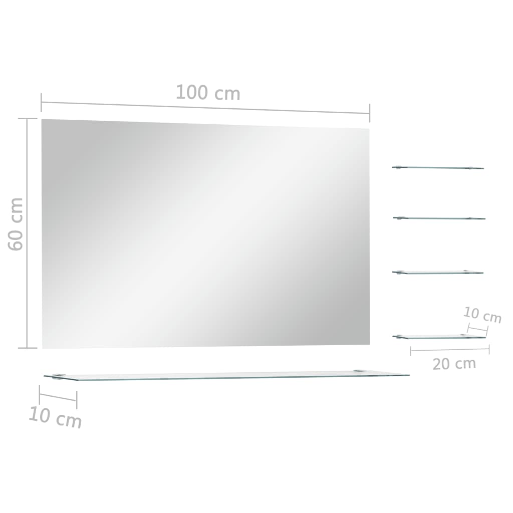 Der Wandspiegel mit Regalen ist elegant gestaltet. Er ist eine praktische und zugleich dekorative Ergänzung für Ihr Badezimmer, Wohnzimmer oder Schlafzimmer. Dieses aus hochwertigem Hartglas gefertigte Badmöbel ist langlebig und leicht zu reinigen. Der rechteckige, gerahmte Spiegel im minimalen und zeitgenössischen Design wertet jeden Raum auf, während vier kleine Ablagen und eine große Ablage zusätzlichen Stauraum bieten. So lassen sich Dekoartikel und Notwendiges übersichtlich und ordentlich aufbewahren. Dieser Spiegel ist einfach zu montieren.