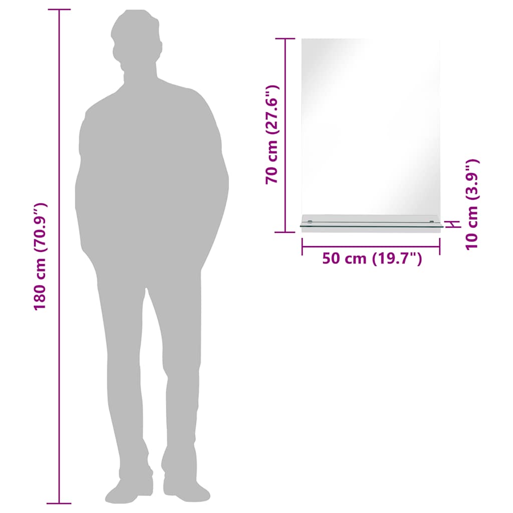 Dieser Wandspiegel mit Regal ist eine praktische und dekorative Ergänzung zu Ihrem Badezimmer, Wohnzimmer oder Schlafzimmer. Das Badmöbel im minimalistischen Stil verfügt über ein praktisches Spiegelregal, auf dem Sie Dekorationsgegenstände oder wichtige Sachen zur Schau stellen können. Unser moderner Badezimmerspiegel mit Regal besteht aus gehärtetem Glas, was seine Haltbarkeit gewährleistet. Der Spiegel kann einfach an der Wand montiert werden.