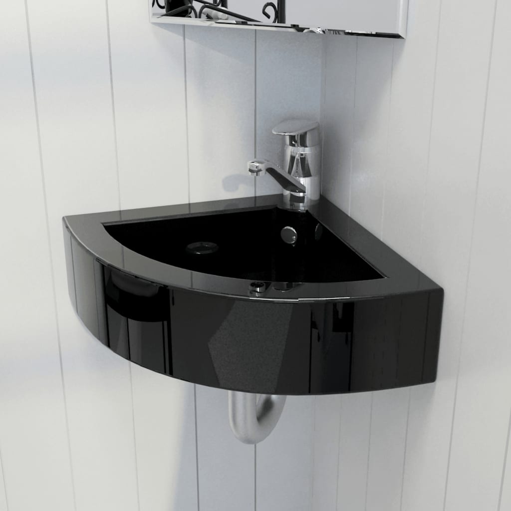 Dieses aus Keramik gefertigte Eckwaschbecken stellt eine schicke und zeitlose Bereicherung für jedes Badezimmer, jeden Waschraum bzw. Schminkraum dar. Dieses Waschbecken dient nicht nur als Becken zum täglichen Gebrauch, sondern stellt auch eine Dekoration in Ihrem Wohnraum dar. Durch sein trendsetzendes und modernes Design mit einer schwarzglänzenden Farbe passt dieses Waschbecken ganz bestimmt zu jeder Inneneinrichtung. Aus Keramik gefertigt, lässt sich das Becken auch ganz einfach reinigen. Darüber hinaus verleiht das Hochglanz-Finish dem Waschbecken eine charmante Note. Ausgestattet mit Überlaufschutz, wird Wasser abfließen, wenn das Becken überfüllt wird. Das Becken ist auch mit einem Wasserhahnloch zur Montage eines Hahns versehen. Bitte beachten Sie, dass der Wasserhahn und die Armatur nicht im Lieferumfang enthalten sind.