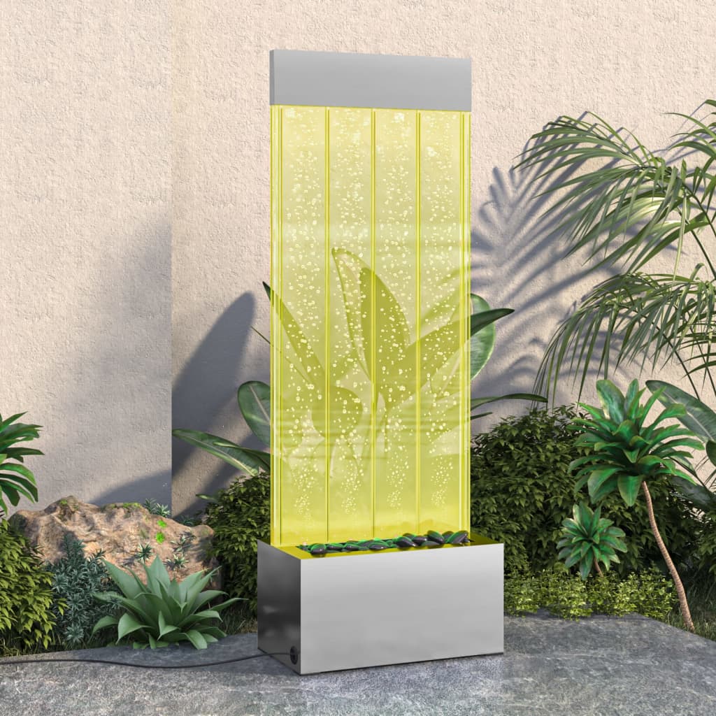 Bringen Sie schlichte Eleganz in Ihren Wohnbereich mit dieser fantastischen Blasensäule mit bunten LED-Leuchten! Langlebiges Material: Dieser Wasserfall ist aus 304 Edelstahl gefertigt, einem Material, das Kratzern und Korrosion widersteht. Daher ist er langlebig. Die Konstruktion aus Acryl sorgt für eine einfache Handhabung, ohne dass Sie sich Sorgen um Rostflecken auf der Oberfläche machen müssen. Bunte LED-Leuchten mit Fernbedienung: Die RGB-LED-Leuchten können in eine breite Palette von Farben wechseln. Über die mitgelieferte Fernbedienung lassen sich verschiedene Geschwindigkeiten der LED-Beleuchtung, LED-Lichtfarben und Helligkeitsstufen bequem auswählen.Elegantes Design: Die Schale auf dem Sockel ist mit mitgeliefertem Kopfsteinpflaster verziert, das den natürlichen Charme der Sprudelsäule verstärkt.