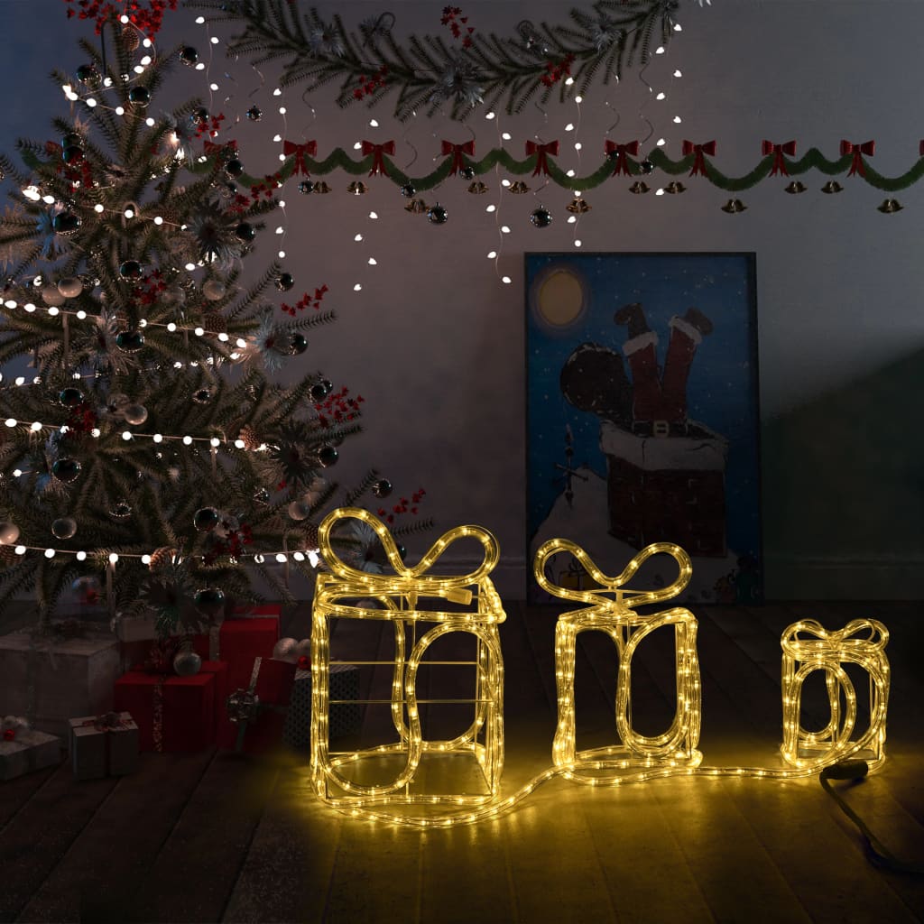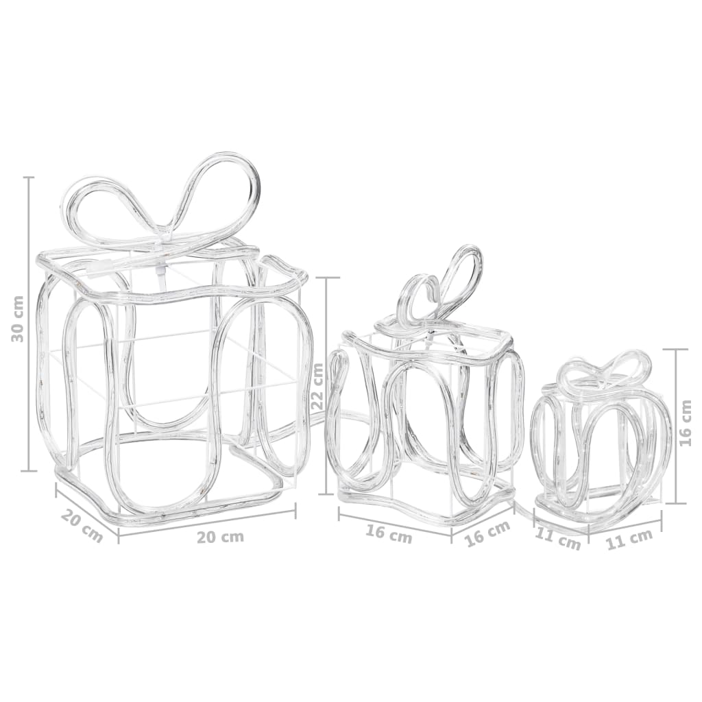 Verleihen Sie Ihrem Zuhause in der kommenden Weihnachtszeit einen Hauch von Glanz mit unseren 3 Geschenkbox-Dekorationen! Aufgrund der Schutzart IP44 ist diese Weihnachtsdekoration wasserdicht. Diese 3D-Geschenkboxen verfügen über warmweiße LED-Leuchten, die sanft leuchten und somit sowohl im Innen- als auch im Außenbereich ein Statement setzen. Bitte beachten: Ein Stecker ist im Lieferumfang enthalten. Aus Sicherheitsgründen darf das Lichtkabel nur in Verbindung mit einem RCD (Fehlerstrom-Schutzschalter; nicht mitgeliefert) verwendet werden.