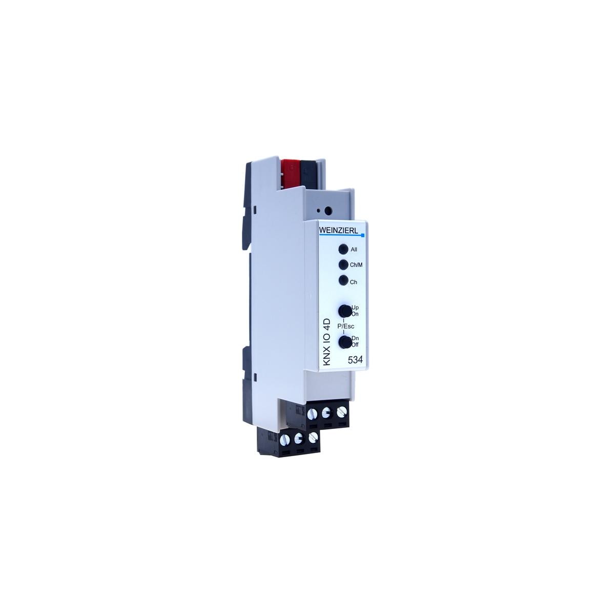 Der KNX IO 534 CV (4D) ist ein kompakter RGB, RGBW und Tunable White Dimmaktor mit 4 PWM-Ausgängen. Der Dimmaktor kann z.B. für LED-Panels oder Streifen mit RGB / RGBW / Tunable White Konfiguration oder als 4 unabhängige Dimmkanäle eingesetzt werden. Jede Konfiguration erlaubt die Steuerung durch Schalttelegramme, relatives Dimmen und Dimmwert. Außerdem sind mehrere Komfortfunktionen integriert, darunter Szenen, Schlummerfunktion, Treppenlicht und Sequenzer. Zwei Taster und drei LEDs ermöglichen eine lokale Bedienung und eine Visualisierung des Gerätezustandes. Zusätzlich zu den Ausgangskanälen verfügt das Gerät über 16 unabhängige Funktionen zur Logik- oder Zeitsteuerung.