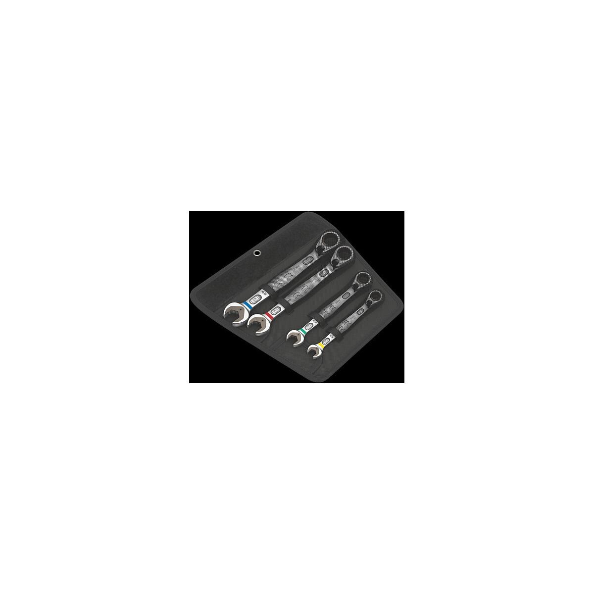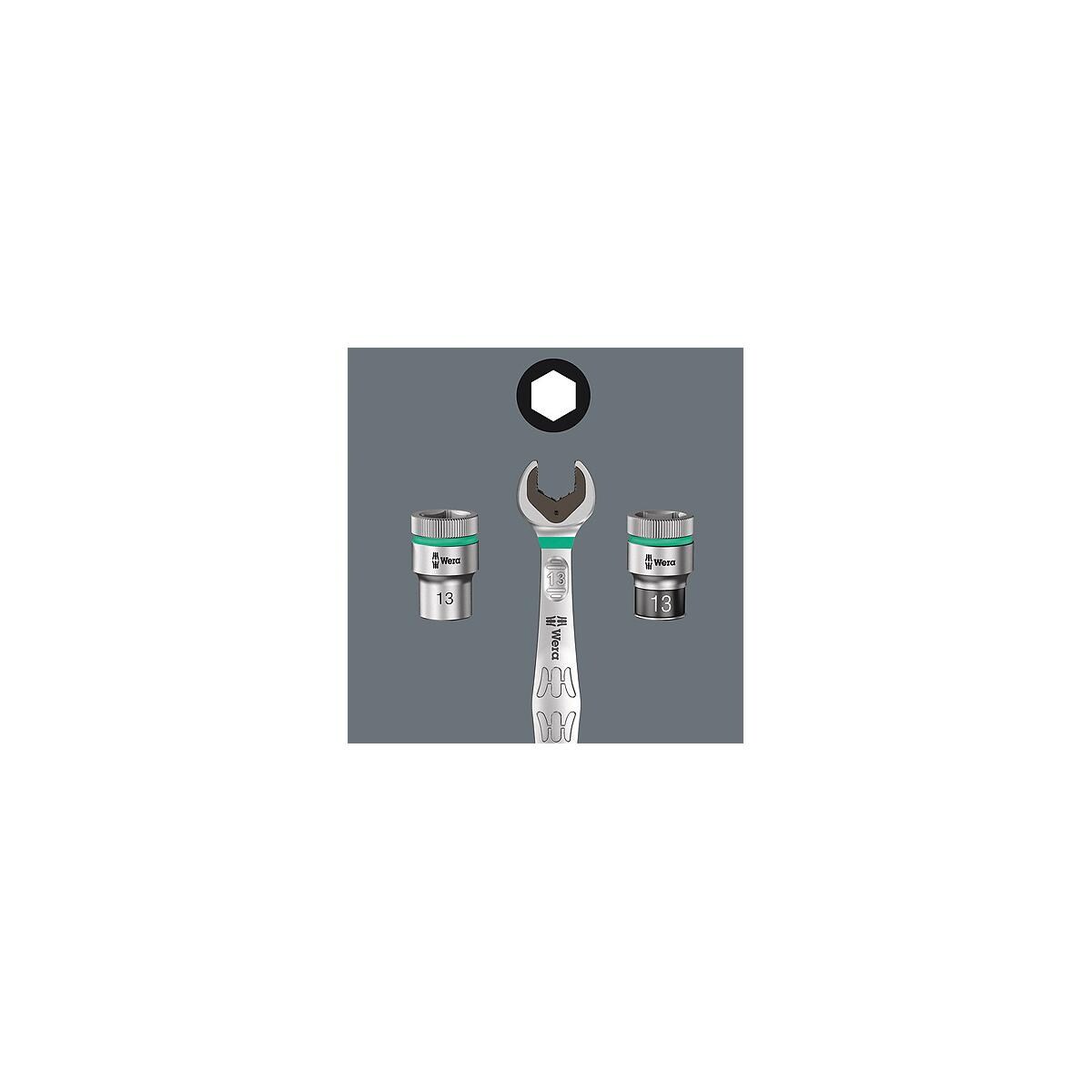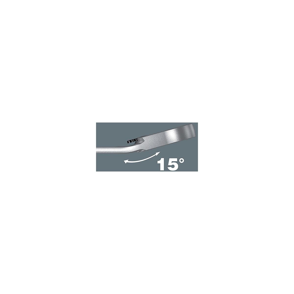 Hochwertiger Ringratschen-Maulschlüssel-Satz von Wera: Joker Maulringratschenschlüssel mit abgewinkelter Ratschenseite und Umschalthebel. Mit Haltefunktion durch Metallplatte im Maul, die die Gefahr des Verlierens von Schrauben und Muttern reduziert. Der integrierte Endanschlag kann das Abrutschen vom Schraubenkopf nach unten verhindern und ermöglicht das Aufbringen hoher Drehmomente. Die auswechselbare Metallplatte im Maul sichert mit extra harten Zähnen Schrauben und Muttern und verringert die Abrutschgefahr. Die Doppelsechskantgeometrie sorgt für die formschlüssige Verbindung mit Schraube oder Mutter und damit ebenso für die Verringerung der Abrutschgefahr. Der geringe Rückschwenkwinkel von nur 30° auf der Maulseite vermeidet zeitintensives Wenden des Schlüssels beim Schrauben.
