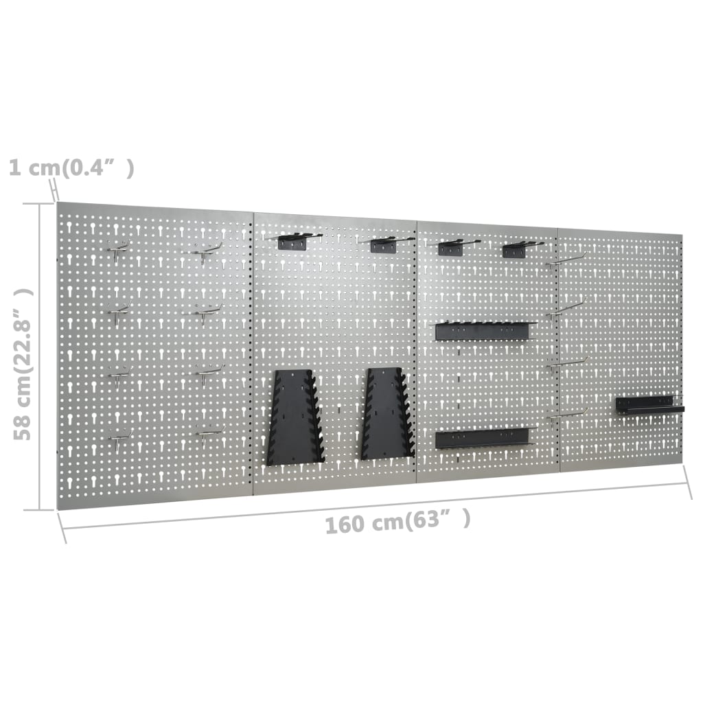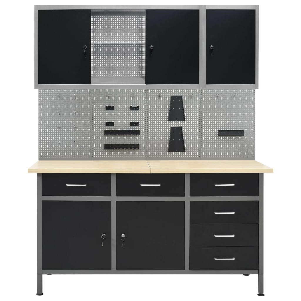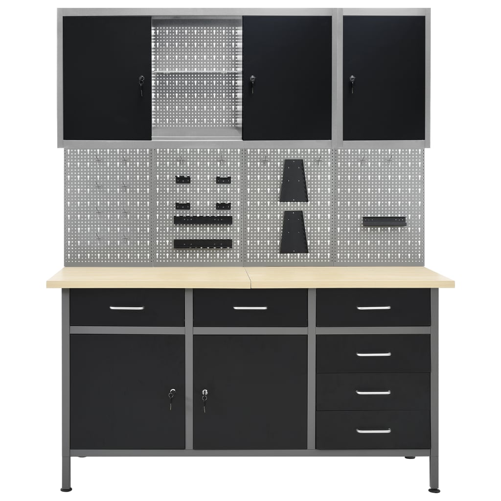 Dieses Werkstatt-Set umfasst 1 Werkbank, 4 Werkzeugwände und 2 Wandschränke. Es ist eine praktische Aufbewahrungslösung für Ihre Geräte und Werkzeuge in der Werkstatt oder Garage. Die hochbelastbare Werkbank, die sich durch viel Stauraum und 500 kg Tragkraft auszeichnet, verfügt über eine große und robuste Tischplatte sowie 6 Schubladen, in denen Sie Ihre Werkzeuge und Zubehör wie Schrauben, Nägel und Klebeband gut organisiert aufbewahren können. Die Schubladen sind mit Kugellager-Gleitschienen versehen. Für die Aufbewahrung größerer Werkzeuge gibt es 2 Regale und 1 großes Schrankfach mit zwei abschließbaren Türen, in denen Bohrmaschinen, Kabeltrommeln und Schleifgeräte problemlos verstaut werden können. Zusätzlich sind die Füße höhenverstellbar. Diese Werkbank besteht aus hochwertigem Stahl und Holzwerkstoff und ist daher besonders robust, langlebig und leicht zu reinigen. Der Zusammenbau gelingt mühelos. Die aus massivem Stahl gefertigte Werkzeugwand kann das Gewicht verschiedener Werkzeuge wie Bohrer, Zangen, Hämmer, Schraubendreher und Schraubenschlüssel tragen. Die Stecktafeln sind perforiert, um Werkzeuge einfach und sicher anzubringen. Die 4 Lochwand-Stecktafeln können für zusätzliche Robustheit miteinander befestigt werden. Mit einer praktischen Breite von 160 cm ist diese Werkzeugwand die ideale Ergänzung für Ihre Werkbank und Ihren Werkstattschrank. Das Werkstatt-Set hat 2 Werkzeugschränke; der größere verfügt über drei höhenverstellbare Fachböden und eine Stecktafel und der kleinere einen höhenverstellbaren Fachboden und eine Stecktafel, die verwendet werden können, um verschiedene Werkzeuge wie Schraubenschlüssel, Zangen, Hämmer, usw. aufzuhängen. Mit zwei abschließbaren Türen ausgestattet (inkl. 2 Schlüsseln pro Tür) bietet der Werkzeug-Wandschrank zusätzliche Sicherheit. Er besteht aus Metall mit einer extra-starken, kratzfesten Beschichtung, wodurch er langlebig und leicht zu reinigen ist. Dieser Artikel muss vor dem Gebrauch zusammengebaut werden.