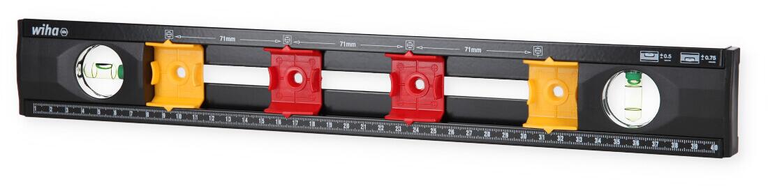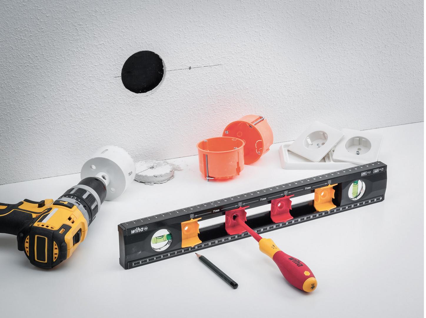 Gerade bei der Installation von Steckdosen am Boden hat es der Elektriker oft schwer, die Libelle auf der Wasserwaage gut einsehen zu können. Zudem entstehen beim Anzeichnen aufgrund der Libellenvertiefungen oftmals unschöne Kerben. Mit diesen Problemfällen macht die Elektriker Wasserwaage von Wiha nun Schluss. Selbst bei spitzem Blickwinkel ist eine perfekte Einsicht auf die Libellen gegeben. Zudem ermöglicht die Wasserwaage dank dem durchgehenden Gehäuse ein unterbrechungsfreies Anzeichnen von Linien. Selbst bei Draufsicht wird mithilfe der raffiniert positionierten Skalen eine komfortable Bemaßung ermöglicht. Einen weiteren Vorteil bei der Elektroinstallation bieten die variablen Abstandsmarkierungen für bis zu 4 Unterputzdosen. Dank der verschiebbaren Markierpunkte für Dosen kann die Wasserwaage je nach Ländervorgabe an die jeweiligen Markierungsabstände angepasst und somit auch vielfältig und international eingesetzt werden. Dank ihrer kompakten Form ist die Wasserwaage zudem perfekt für den mobilen Einsatz geeignet und kann bequem im Wiha Elektrikerkoffer verstaut werden.