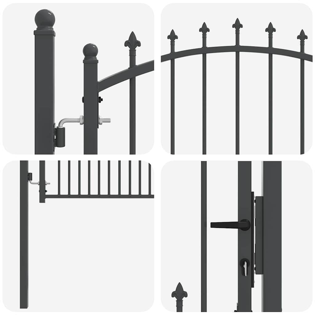 Das moderne Gartentor mit Spitzen setzt einen coolen Akzent in jede Outdoor-Umgebung. Dieses rechteckige Tor mit klaren Linien und schlichtem Stil bietet sowohl optischen Reiz als auch praktische Funktionen. Der pulverbeschichtete Stahl sorgt dafür, dass es wetterfest ist und sich hervorragend für Gärten oder Terrassen eignet. Materialqualität: Hergestellt aus pulverbeschichtetem Stahl, der Widerstandsfähigkeit gegen Witterungseinflüsse garantiert. Dieses Material sorgt für eine glatte Oberfläche, die den modernen Look unterstreicht, und bietet langfristige Haltbarkeit. Seine natürliche Stärke stellt sicher, dass dein Außenbereich zu jeder Jahreszeit sicher bleibt, bei minimalem Pflegeaufwand für ein makelloses Erscheinungsbild. Robuste Schlösser: Mit Riegelschlössern ausgestattet, sorgt das Tor für mehr Sicherheit und verhindert unbefugten Zugang. Diese Schlösser sind stark und kommen mit einem Schlüssel, was sie besonders für schwere Türstrukturen geeignet macht. So bleibt der Garten und die Terrasse auch dann geschützt, wenn sie nicht im Blick sind, und es sind drei passende Schlüssel mit dabei. Architektonischer Stil: Der gewölbte Oberteil kombiniert mit schicken Spitzen bietet eine stilvolle Absperrung, die dein Eigentum aufwertet. Dieses Design-Element erhöht nicht nur die visuelle Anziehungskraft, sondern bietet auch einen zusätzlichen Schutz gegen das Klettern. Die Balance zwischen Form und Funktion macht das Tor in verschiedenen Außenbereichen einsetzbar. Komplettpaket: Geliefert mit zwei stabilen Pfosten und Scharnieren, was die Installation erleichtert. Praktische Montageanforderungen sorgen dafür, dass dein Außenbereich gleichmäßig aussieht. Die Komponenten sind so gestaltet, dass sie einfach zu bedienen und langlebig sind und eine zuverlässige Funktionalität bieten. Pflegehinweise: Halte die Eleganz einfach, indem du es mit einem feuchten Tuch abwischst. Diese einfache Pflege-Routine sorgt dafür, dass das Tor genauso gut aussieht wie am ersten Tag, mit minimalem Aufwand.