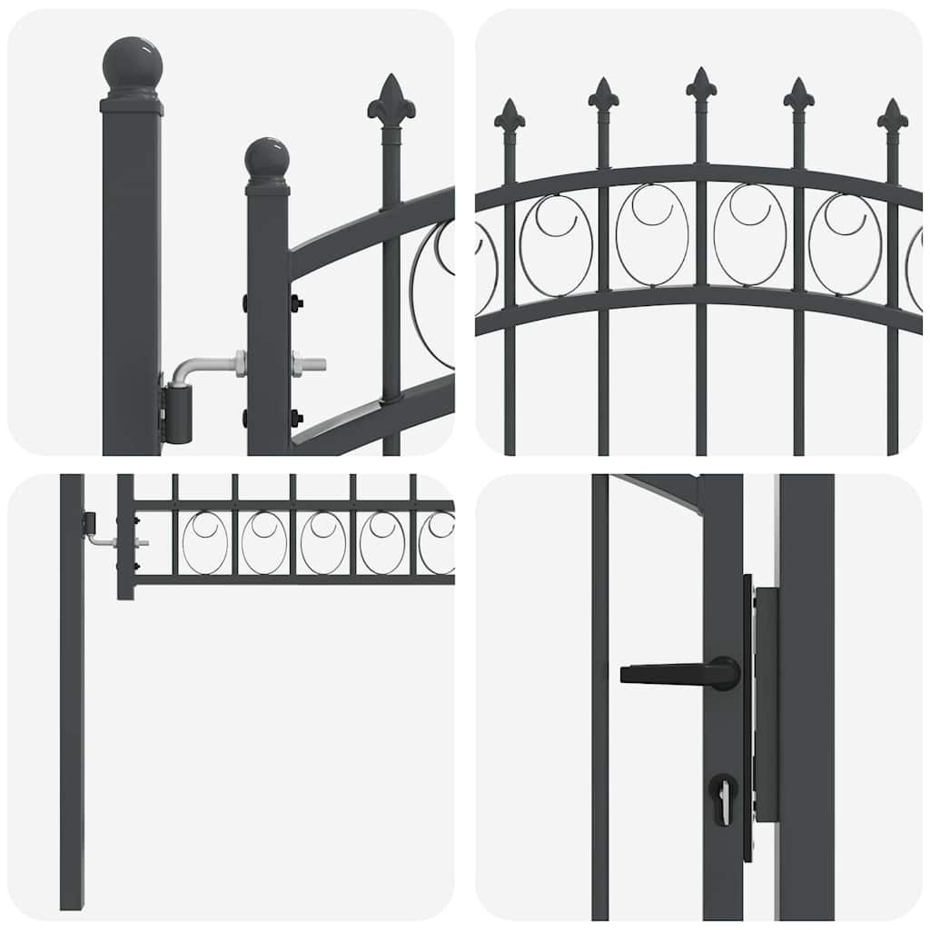 Dieses schicke Gartentor bringt Funktionalität und modernes Design in jeden Außenbereich. Es ist ideal für Garten- und Terrassenbereiche und kombiniert zeitloses Design mit Sicherheit. Hergestellt aus robustem, pulverbeschichtetem Stahl, ist dieses rechteckige Tor nicht nur stabil und wetterfest, sondern sieht auch gut aus und verbessert das Gesamtbild deines Anwesens. Das gewölbte Oberteil mit seinen eleganten Spitzen setzt einen stylischen Akzent und sorgt dafür, dass die nötige Sicherheit und Abgrenzung in deinem Garten gegeben sind. Pulverbeschichteter Stahl: Aus hochwertigem pulverbeschichtetem Stahl gefertigt, hält das Tor verschiedenen Wetterbedingungen stand und sorgt für Langlebigkeit und wenig Wartungsaufwand. Die strapazierfähige Oberfläche schützt vor Stößen und Kratzern und macht es perfekt für den dauerhaften Außeneinsatz. Sichere Riegelverschlüsse: Mit Riegelverschlüssen ausgestattet, bietet dieses Tor mehr Sicherheit und stellt sicher, dass dein Garten vor unerwünschtem Zutritt geschützt bleibt. Die Schlösser sind stabil und brauchen einen Schlüssel, was dir ein gutes Gefühl gibt, dass dein Außenbereich sicher ist. Gewölbtes Design: Das elegante gewölbte Oberteil erhöht den visuellen Reiz deines Gartens. Dieses Design, zusammen mit schicken Spitzen, bringt einen modernen Touch in jede Landschaft und schafft einen einladenden Eingang, der sowohl funktional als auch stylisch ist. Komplettset: Geliefert mit allem, was du brauchst, inklusive zwei stabilen Pfosten, starken Scharnieren und drei passenden Schlüsseln. Dieses Komplettset macht die Montage einfach und sorgt für Stabilität nach der Installation, damit du schnell und effektiv den gewünschten Look erreichen kannst. Pflege & Wartung: Leicht zu pflegen, benötigt dieses Tor nur gelegentliches Abwischen mit einem feuchten Tuch, damit es frisch und sauber bleibt, ohne aufwändige Pflege. So bleibt es lange schön und funktional.