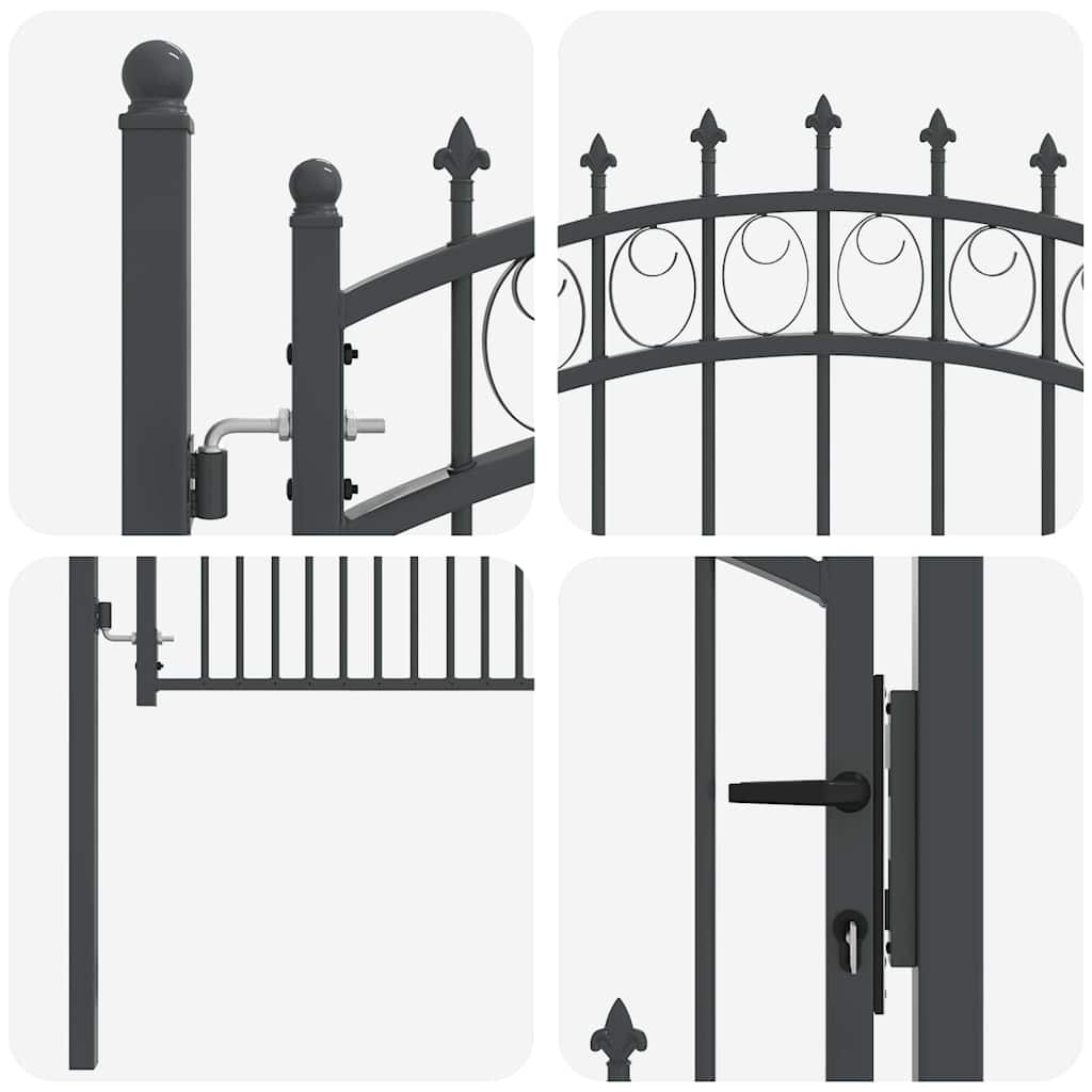 Dieses Zauntor mit Spitzen steht für moderne Einfachheit und hat eine schlanke, pulverbeschichtete Stahlkonstruktion mit klaren Linien und wenig Schnickschnack. Es ist ideal für Gärten und Terrassen und verbindet Stil und Praktikabilität auf beeindruckende Weise. Das gewölbte Design bringt eine elegante Note und macht es nicht nur funktional, sondern auch optisch ansprechend. Die robuste Bauweise sorgt für zuverlässige Leistung bei jedem Wetter und bietet eine sichere Abgrenzung. Pulverbeschichteter Stahl: Das Tor ist aus hochwertigem pulverbeschichtetem Stahl, der besonders langlebig und wetterfest ist. Diese Beschichtung schützt nicht nur, sondern sorgt auch dafür, dass das Tor gut aussieht, egal wie lange es draußen ist. Das robuste Material bedeutet weniger Pflegeaufwand, was es ideal für alle macht, die ein schönes und praktisches Außentor suchen. Komponenten inklusive: Kommt mit zwei Zaunpfosten und stabilen Scharnieren für eine einfache Montage sowie drei passenden Schlüsseln. Die Bestandteile sind sorgfältig ausgewählt, damit alles sicher und zuverlässig funktioniert, egal ob für private Gärten oder Gemeinschaftsbereiche. Diese Teile fügen sich perfekt in das funktionale Design des Tors ein. Stylishes gewölbtes Design: Mit seinem eleganten, gewölbten Oberteil und den dekorativen Spitzen passt dieses Tor zu vielen Gartenstilen. Es verbindet klassische Eleganz mit einem modernen Touch und erhöht den ästhetischen Wert jedes Außenbereichs. Das Tor fügt sich geschickt in die natürliche Schönheit eines Gartens ein und verwandelt eine einfache Barriere in einen stylishen Akzent. Vielseitigkeit für draußen: Ideal für Gärten und Terrassen, sorgt das Design des Tors für Privatsphäre und trennt unterschiedliche Bereiche. Sein modernes Aussehen integriert sich nahtlos in zeitgenössische Außenanlagen und macht das Tor zu einer vielseitigen Ergänzung für verschiedene Landschaften. Es bietet einen einladenden Eingang und hält gleichzeitig die gewünschte Privatsphäre. Einfacher Aufbau und Pflege: Du brauchst zwei Personen und einen Schraubendreher, um das Tor schnell zu montieren. Nach der Installation sorgt es für Stabilität und Sicherheit. Für die Pflege empfehlen wir regelmäßige Überprüfungen der Scharniere und Schrauben, damit es lange hält. Du kannst die Oberfläche einfach mit einem milden Reinigungsmittel und Wasser reinigen, um das Tor wie neu zu erhalten und die Lebensdauer zu verlängern.